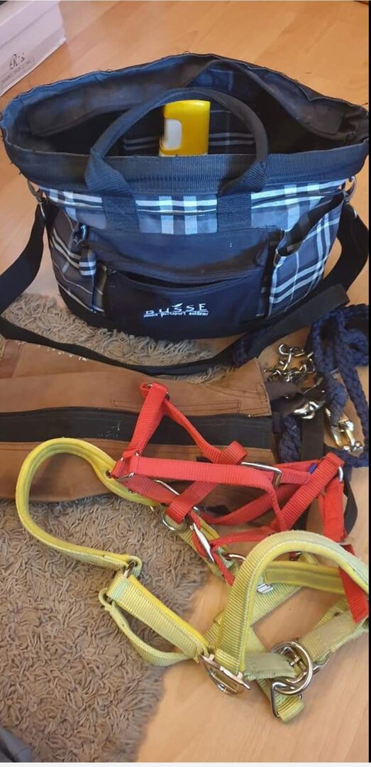 Reinigingszak met accessoires - Bied hier een schoonmaakzak aan van Busse met inhoud. Leidende keten Touw 2 halsters manen spray Hoef schraper Borstels