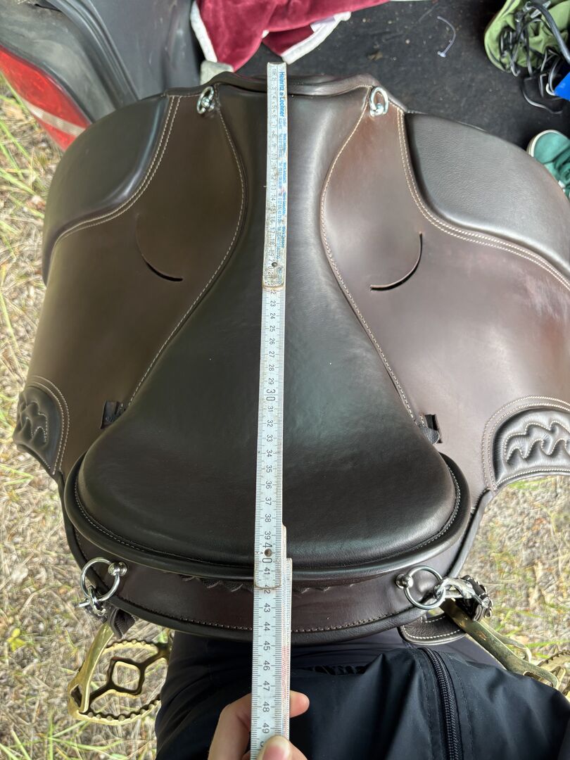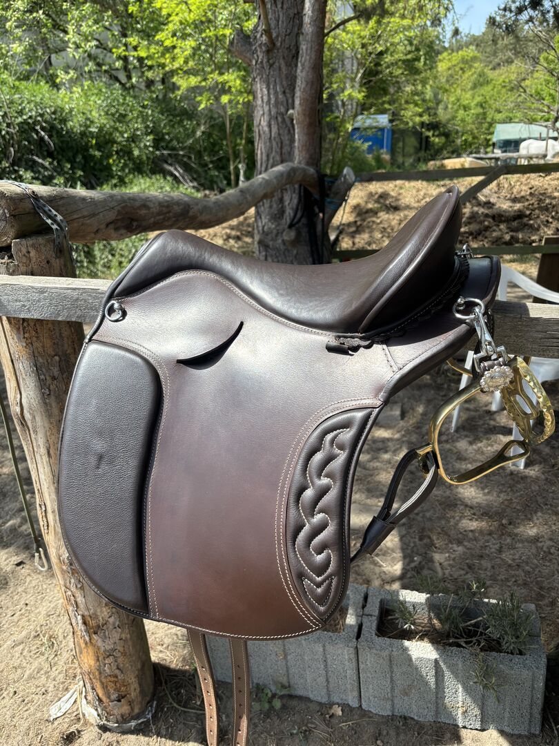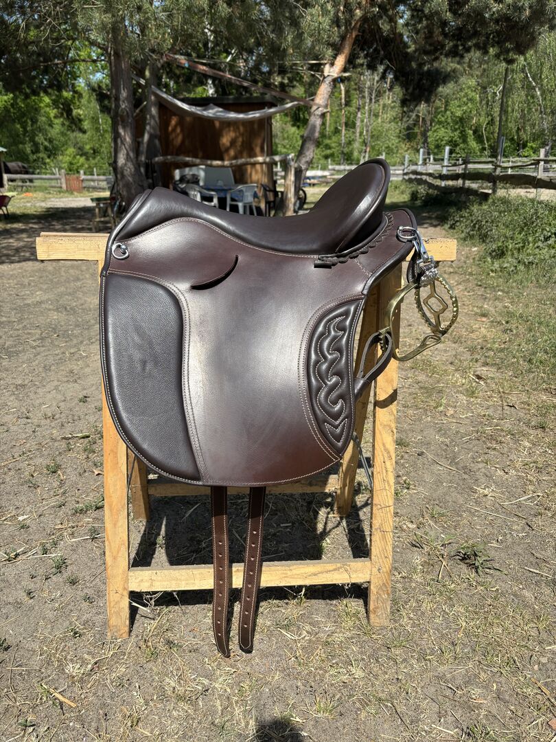 Reiszadel in Spaanse stijl - Ik bied een 17,5 inch zadel aan met een geweldige uitstraling en een verstelbare slokdarmplaat. Het zadel is gereden op zwaardere paarden (koudbloedmix, Noriker). Inbegrepen zijn de slokdarmplaten, stijgbeugels + stijgbeugelriemen en extra klittenband pads voor betere verstelbaarheid. Meer informatie is te vinden op de foto's. Het zadel wordt verkocht omdat het mij helaas niet past.