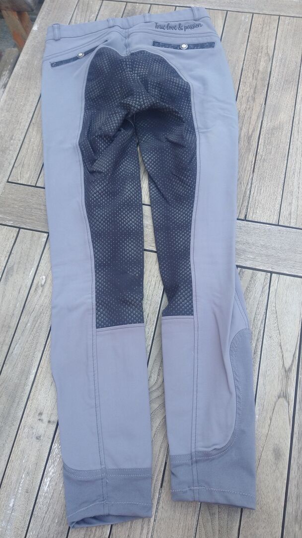 Reitleggins grau aus Softshell mit Grip-Vollbesatz in schwarz, schmal geschnitten. Größe 170 / 176. Vorne zwei kleine Taschen