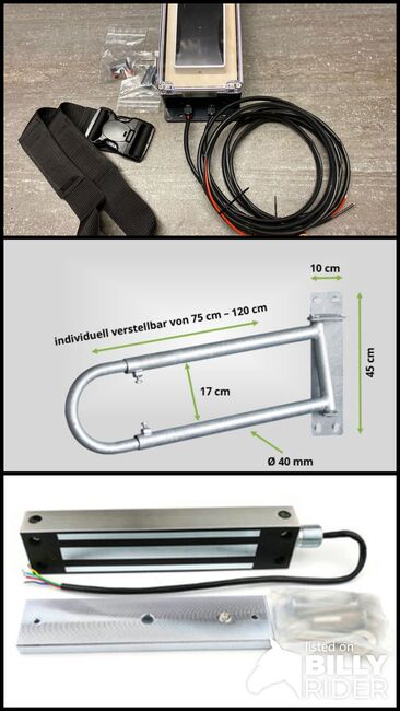 RFID-bestuurd eenrichtingshek | individuele weidegang | selectie | NIEUW - Te koop is een RFID-bestuurd eenrichtingshek voor individuele selectie in de stal en op de weide: - Transpondergestuurd eenrichtingshek voor automatische selectie in voer- en stalgebieden en gebieden met beperkte toegang gedurende een bepaalde tijd. - Gebruik als een toegangsbarrière tot gebieden die alleen beschikbaar mogen zijn voor geselecteerde paarden of voor een beperkte tijd, bijv. weide, chill-out gebieden, gebieden voor ad libitum voeren of extra (voeder)gebieden voor lager geklasseerde/oudere paarden. - Elk paard wordt individueel herkend met behulp van een RFID-transponder, leesbereik tot 50 cm, optioneel genaaid in hals-/enkelriemen of geweven in de manen - Bedrijfsspanning: 12 V - Leveringsomvang: 1 x transpondergestuurde deuropener incl. RFID-lezer en voedingskabel, 1 x RFID-halsband, 1 x SmartOpen elektromagneet (tot 320 kg), 1 x OneWay-poort, 1 x afrasteringsaansluitkabel