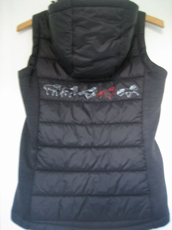 Riding Vest Karlslund Hooded Vest Down Vest Top Rider - Hallo lieve IJslandse paardenvrienden, Ik wil graag deze combinatie rij-gilet met capuchon in maat XS verkopen, die ik zelf heb ontworpen en vervaardigd. Het is absoluut uniek en wie het IJslandse ruitermerk Karlslund kent, weet dat een ruitergilet niet bestaat. Het gilet heeft een tweewegrits, twee ritszakken en de capuchon is vastgezet met een drukknoop, zodat hij niet rondfladdert in de galop. Het heeft het Karlslund-logo op de voorkant met de IJslandse paarden in tölt en de vijf gangen van het IJslandse paard op de achterkant.