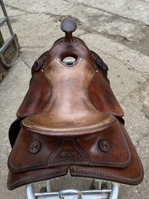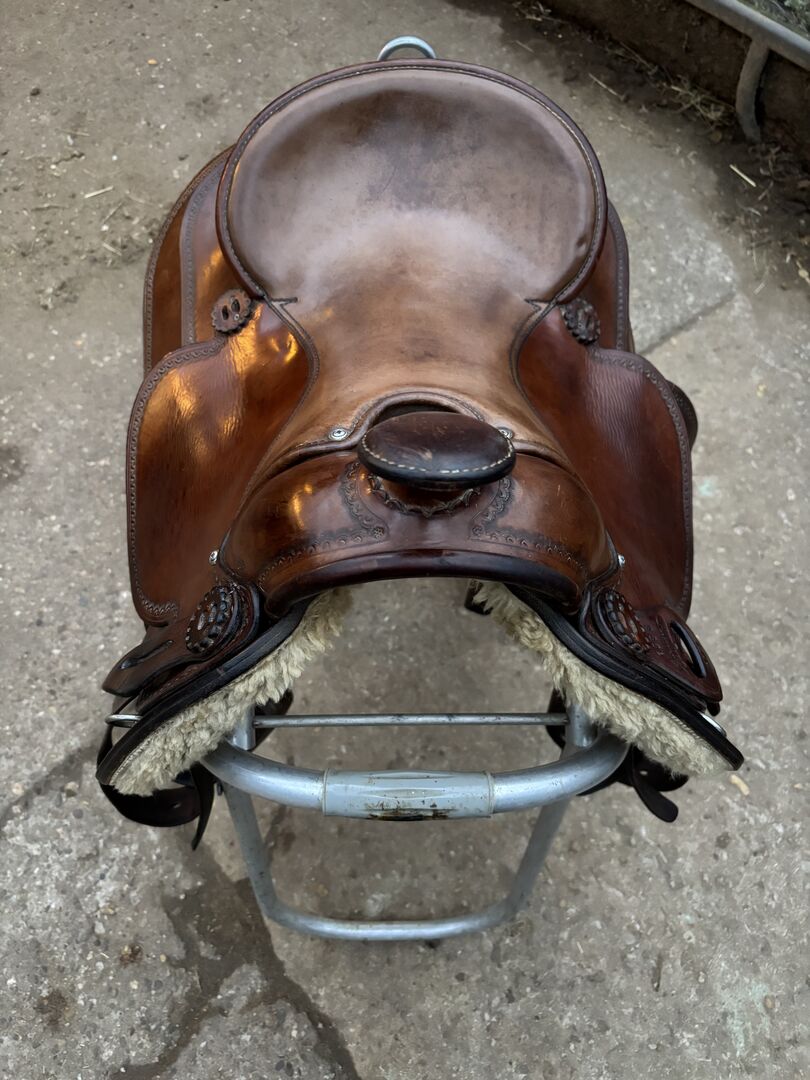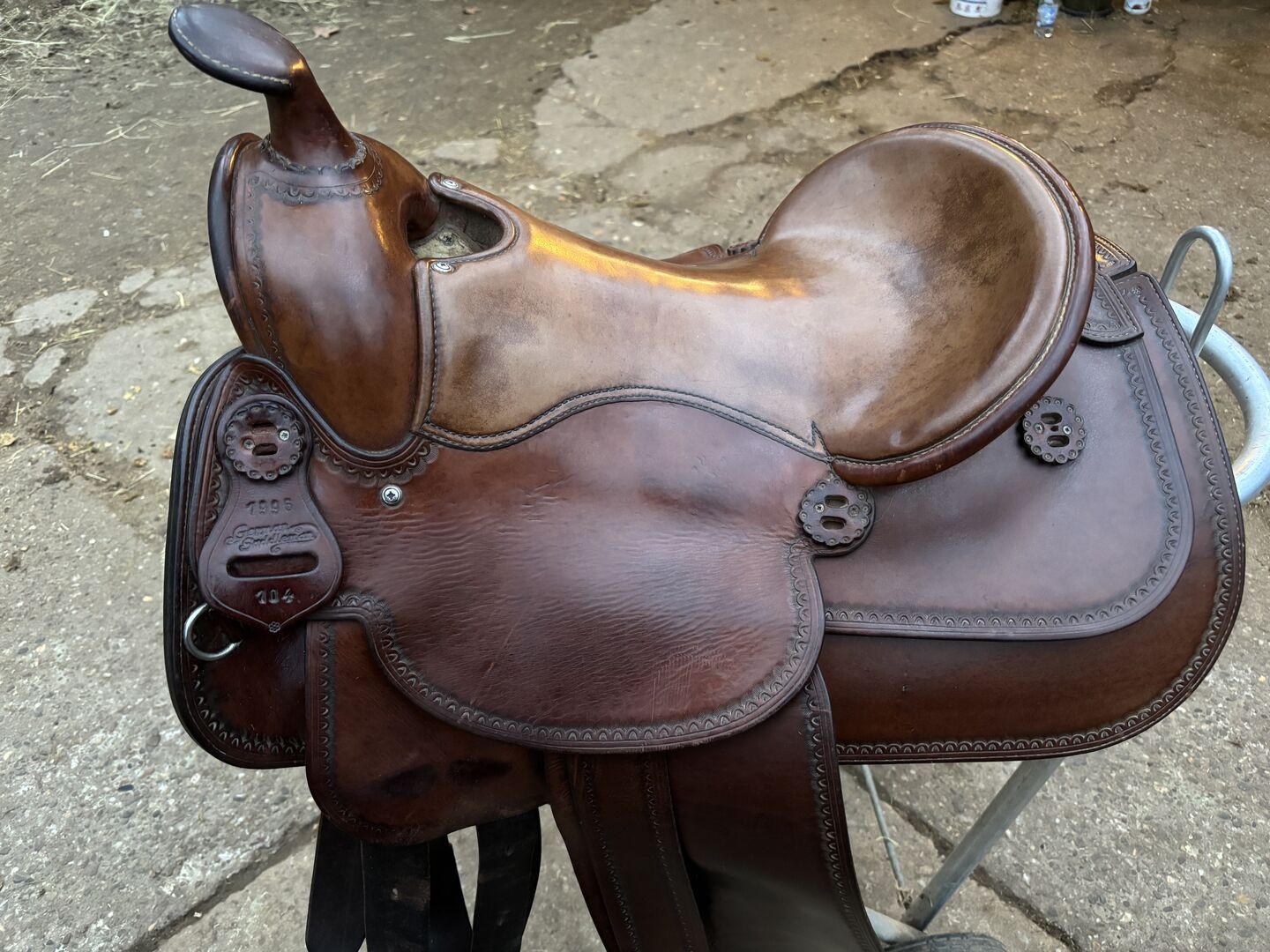 Riese western zadel - Prachtig zeer goed onderhouden westernzadel op maat gemaakt door Rieser Saddlery (https://www.rieser-sattel.de/) Full Quarter Horse boom, zeer comfortabel 16 inch zadeloppervlak. Past helaas niet meer op mijn paard, dus ik moet er afstand van doen. Graag ophalen