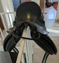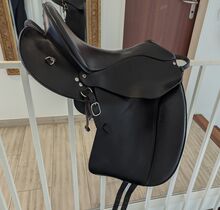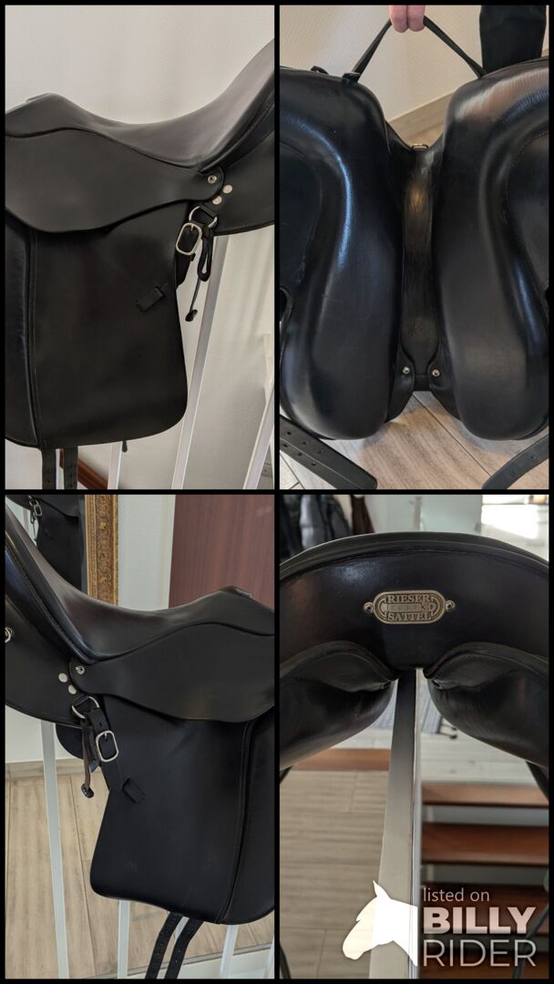 Rieser dressuur- en trailzadel, zwart, 18'' - Wij verkopen een zeer comfortabel, zwart 18'' Rieser zadel voor dressuur en trailrijden met 3D houten boom. De 3D boom is aanpasbaar. Het zadel is gepast op onze Westfaalse ruin (164cm, vrij slank gebouwd). De Equiscan gegevens van ons paard zijn beschikbaar en kunnen worden opgevraagd.