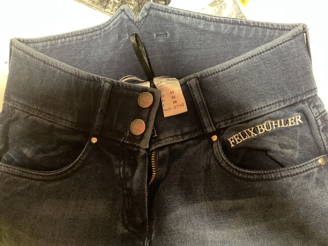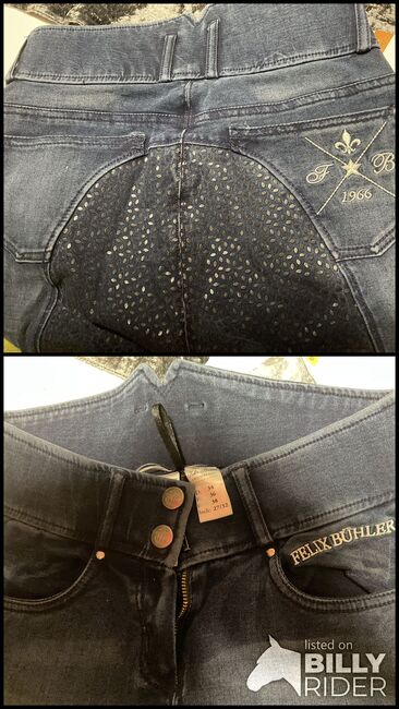 Rijbroek legging met bies maat 34 donkerblauw - Ik verkoop een rijbroek legging van Felix Bühler, maat 34, donkerblauw. Niet gedragen. Volledig zitvlak, siliconen.