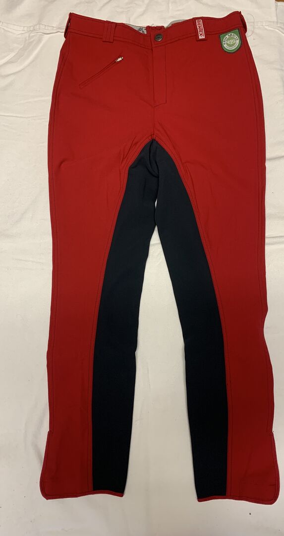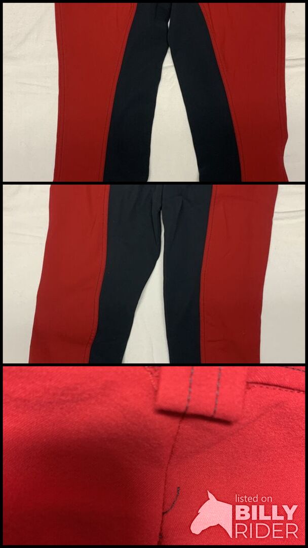 Rijbroek met volledige zit - 40 - Rijbroek rood met blauw vol zitvlak RTS/Bentex Nooit gedragen Helaas is de naad op één plaats losgeraakt (zie foto) Maat 40