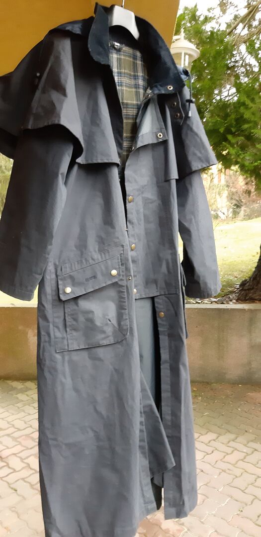 Rijdende mackintosh - Rijbroek met afneembare capuchon in maat XS, van gewaxt linnen, donkerblauw, 2 opgezette buitenzakken, 1 binnenzak met klittenbandsluiting, 2 beenlussen.