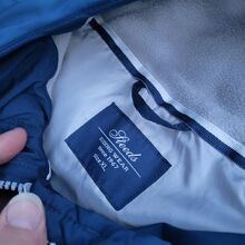 Het heeft een capuchon en twee steekzakken met drukknopen.