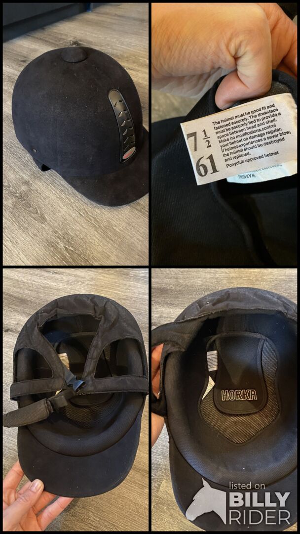 Rijhelm Horka 61 - Ik verkoop een gebruikte maar in goede en valvrije staat verkerende rijhelm van Horka. Het is met fluweel bekleed en zacht gewatteerd aan de binnenkant. Het is gebruikt maar ziet er goed uit, zie foto's. De maat is 61, dus hij past op een hoofdomtrek van 61 cm. Ik heb het zelf tweedehands gekocht, maar helaas past het niet. De helm is volledig gereinigd en klaar voor gebruik.