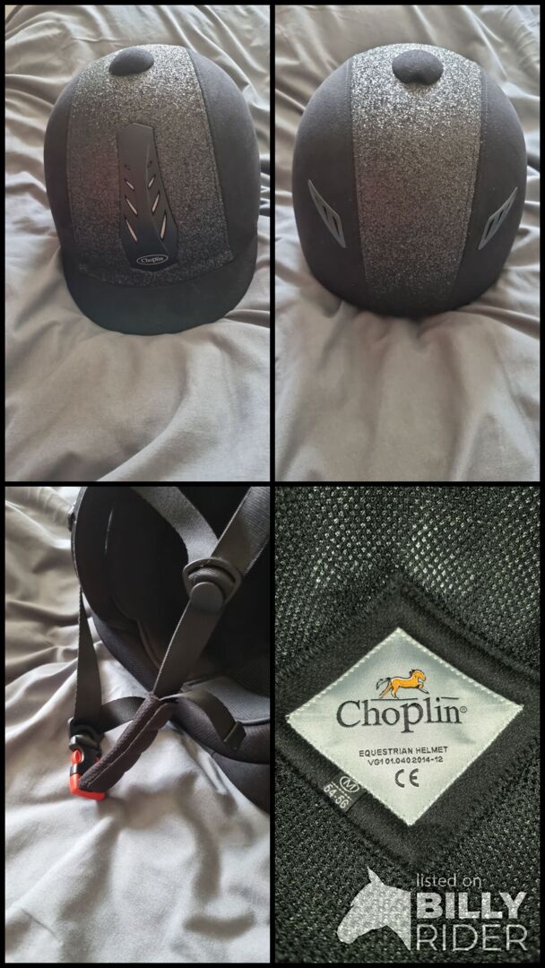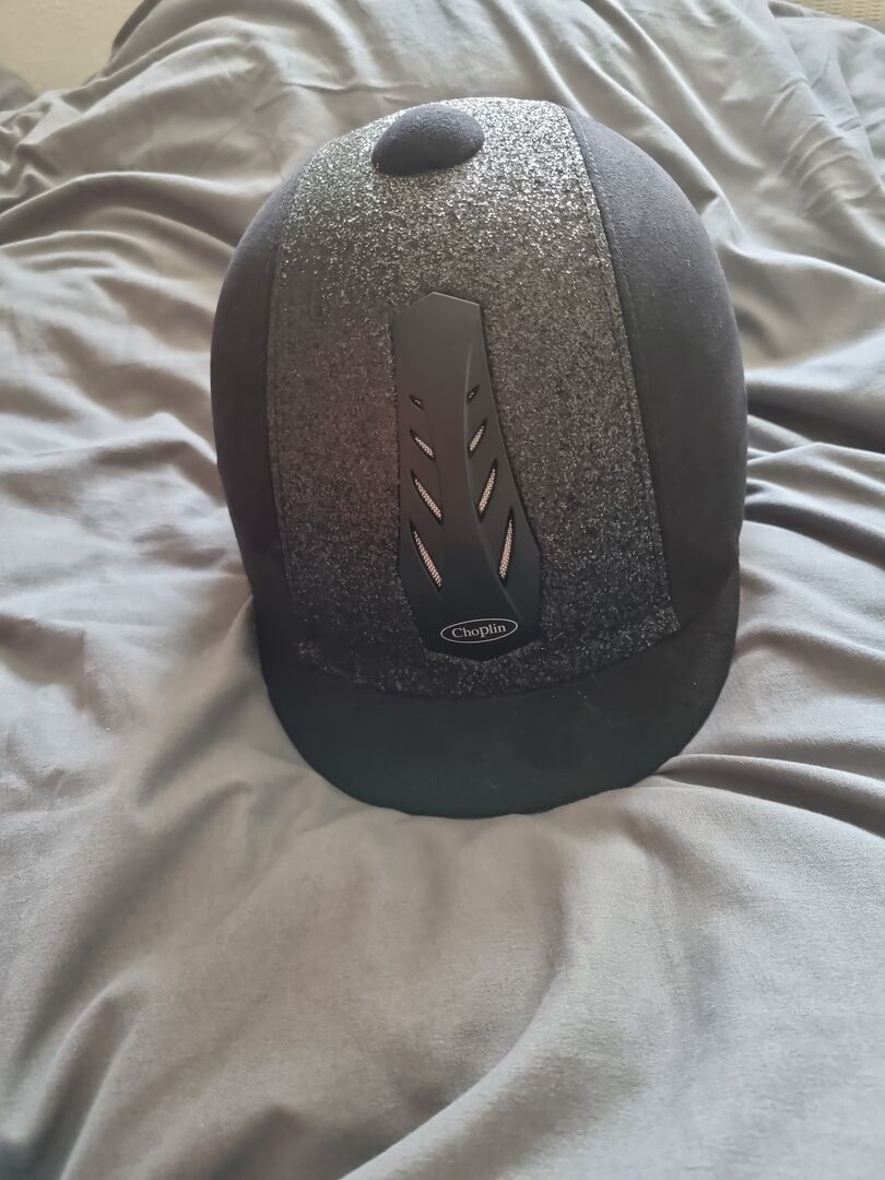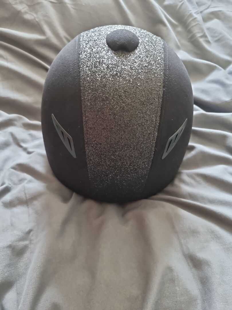 De helm is zwart en de glitter