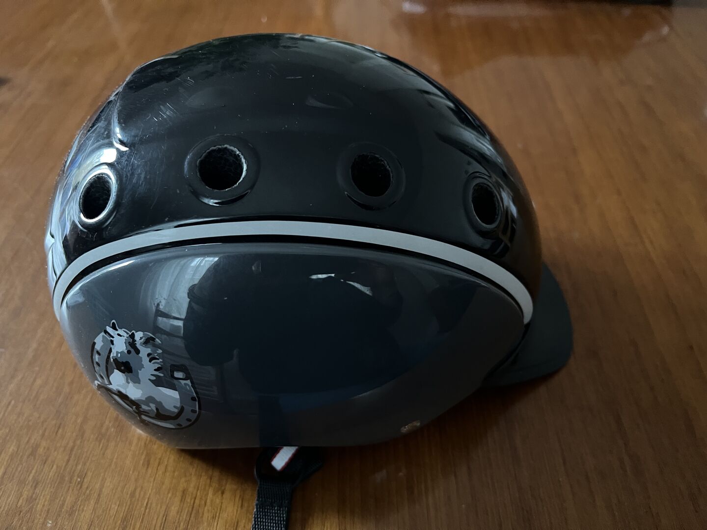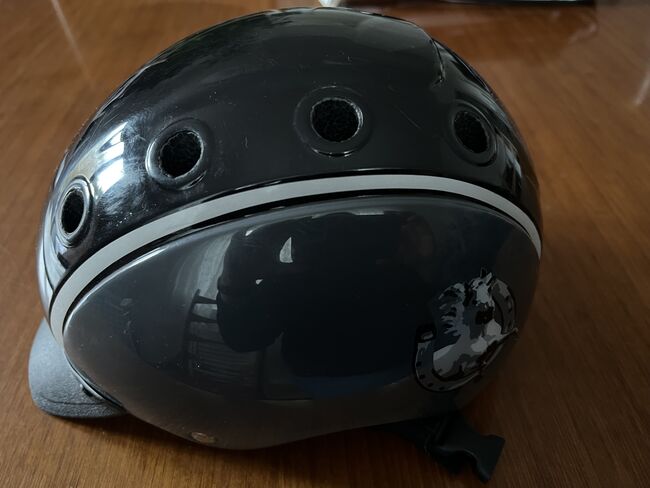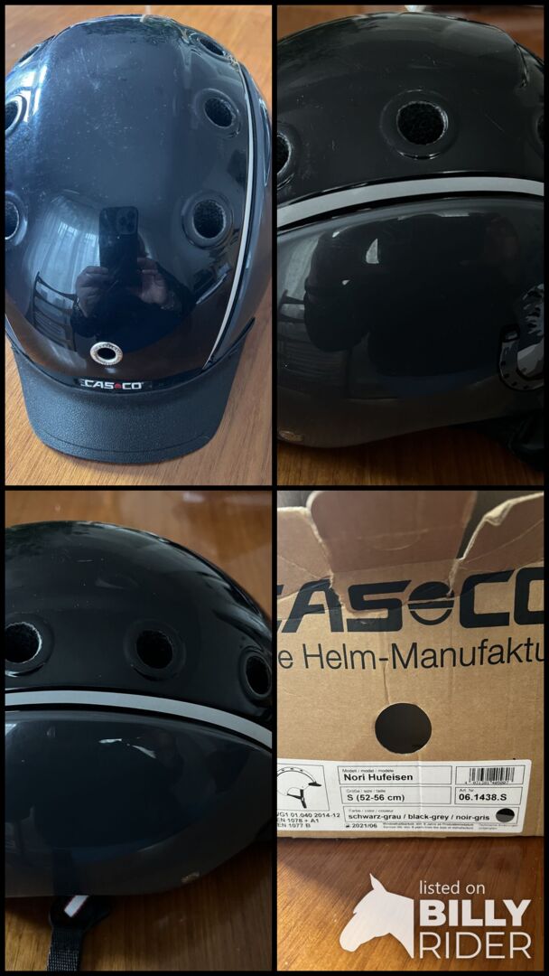 Rijhelm voor kinderen by casco - We verkopen een ongevalvrije rijhelm van Casco in maat S (52-56 cm), die slechts een paar keer gedragen is tijdens de vakantie. De basiskleur is zwart. Op de zijkanten is een paard met hoefijzers gedrukt (zie foto's).