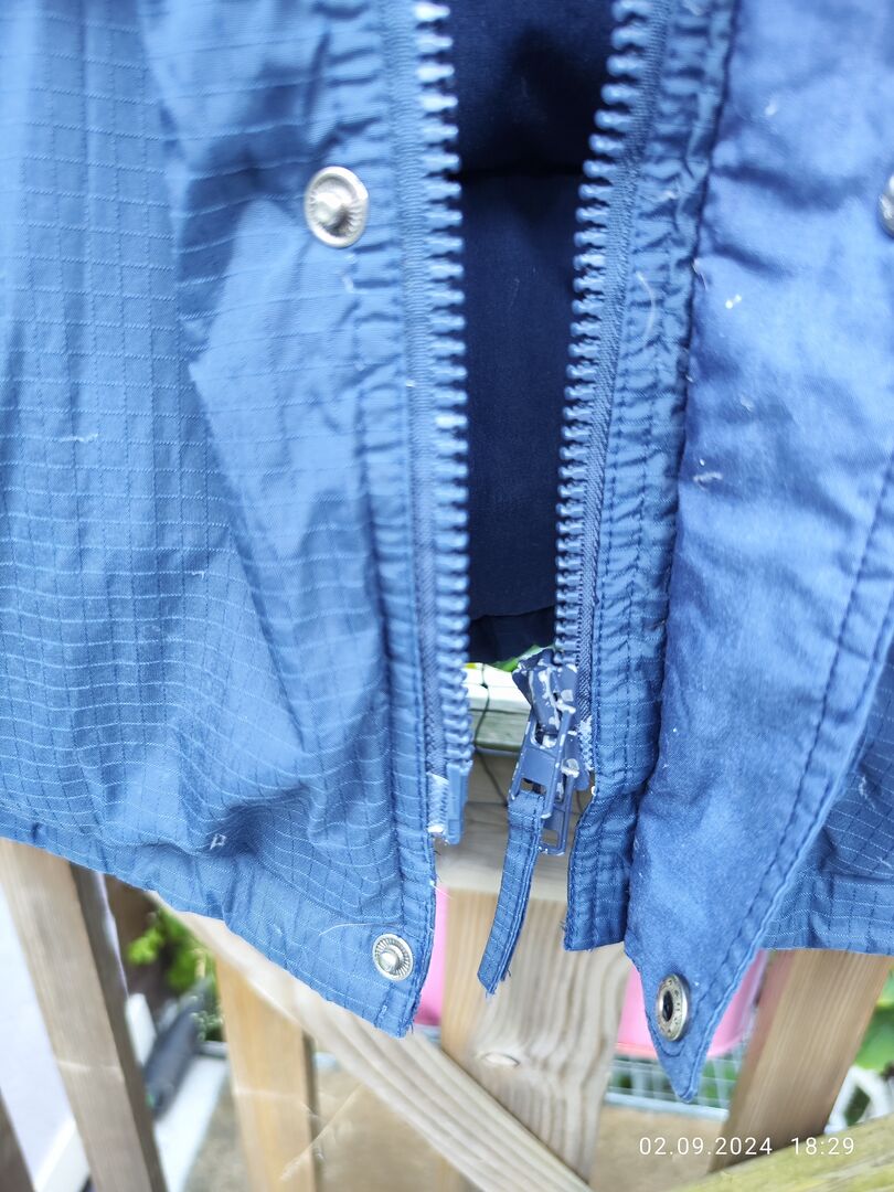De enige beschadiging is de rechter binnenzak bij de drukknoop. De katoenen stof zit hier vol gaten
