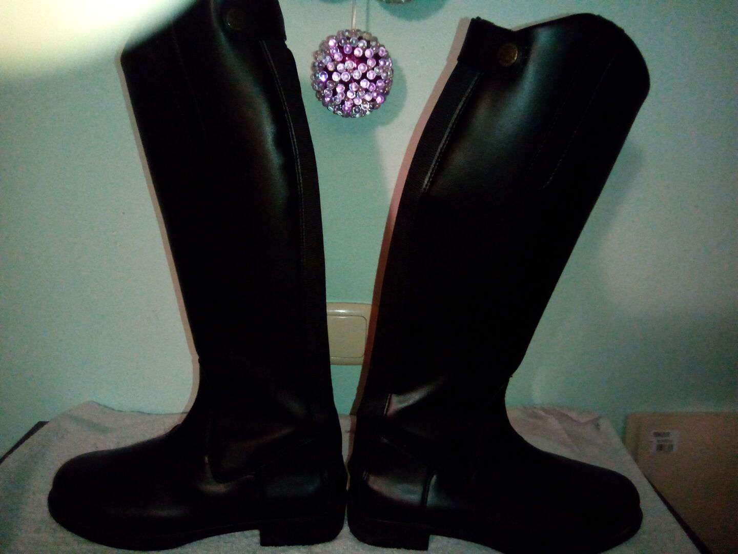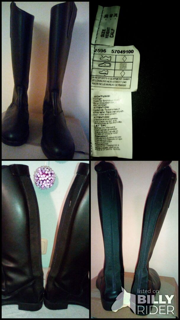 Rijlaarzen - zwarte rijlaarzen, zeer goede staat aangezien ze alleen voor het toernooi zijn gebruikt, - Voetlengte : 25,5 - 26 cm - Hakhoogte : 2,5 cm - Laars hoogte binnen : 39 cm - Laars hoogte buiten : 41 cm - Schachtbreedte : - 35 cm