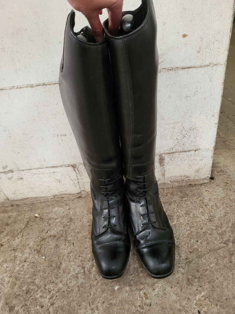 Het zijn leren laarzen met gedeeltelijke vetersluiting in maat 41 (ik draag eigenlijk schoenmaat 39 - 40, maar heb ze een maat groter gekocht vanwege rijsokken).