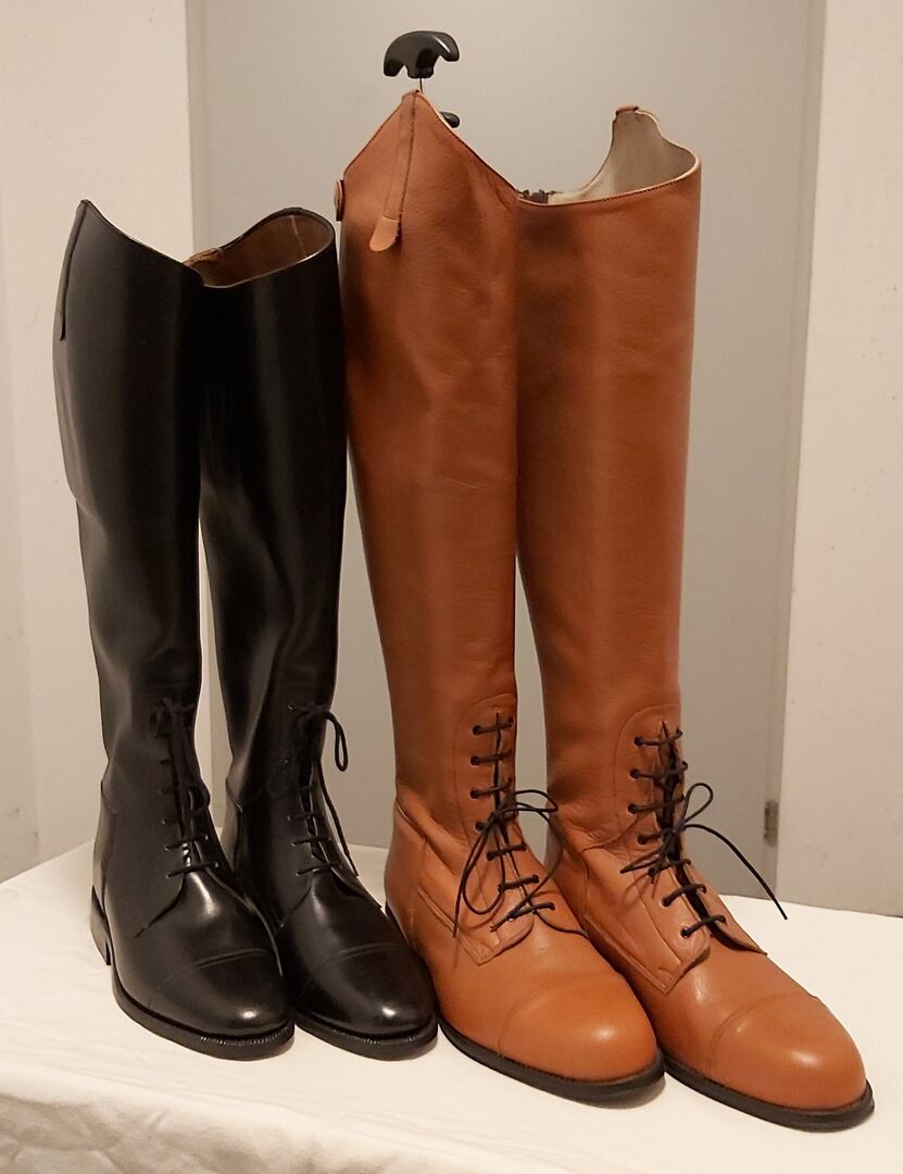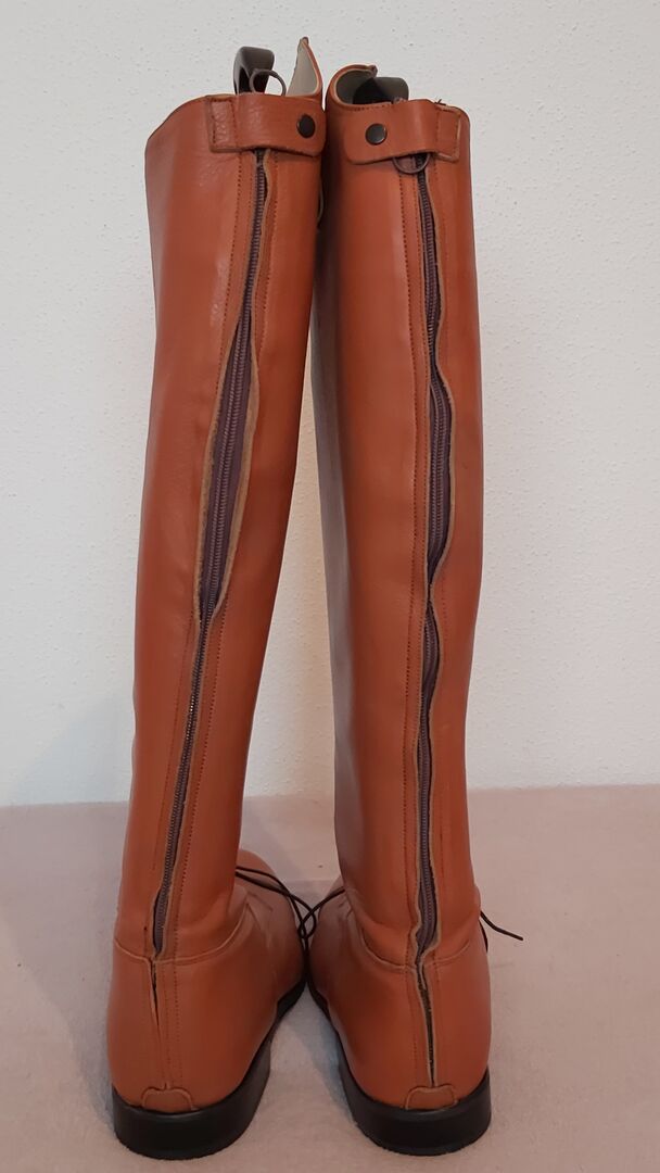 Rijlaarzen / M. Dècima - Springende dressuurlaarzen van M. Dècima heren/dames, zeer mooi zacht leer, rits aan de achterkant, vetersluiting aan de voorkant Maat 43; schachthoogte buiten 54,5 cm, binnen 50,5 cm schachtbreedte 39 cm Verlaagd van 428 € naar 210,00 €! Prijs bespreekbaar!