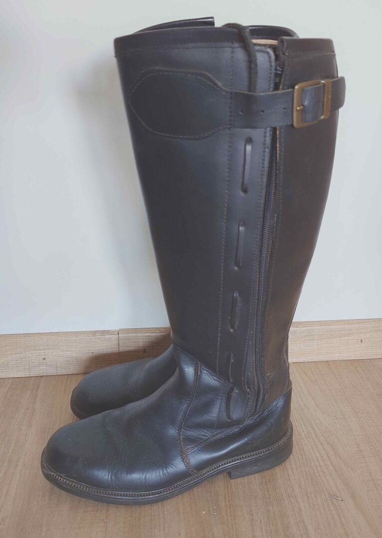 Rijlaarzen maat 41 - Gebruikte leren rijlaarzen met ritssluiting en verstelbare kuitwijdte te koop. De vetersluiting aan de zijkant is voorzien van een leren riempje. Er is ook een ritssluiting. De binnenkant is gevoerd met lichtgekleurd leer.