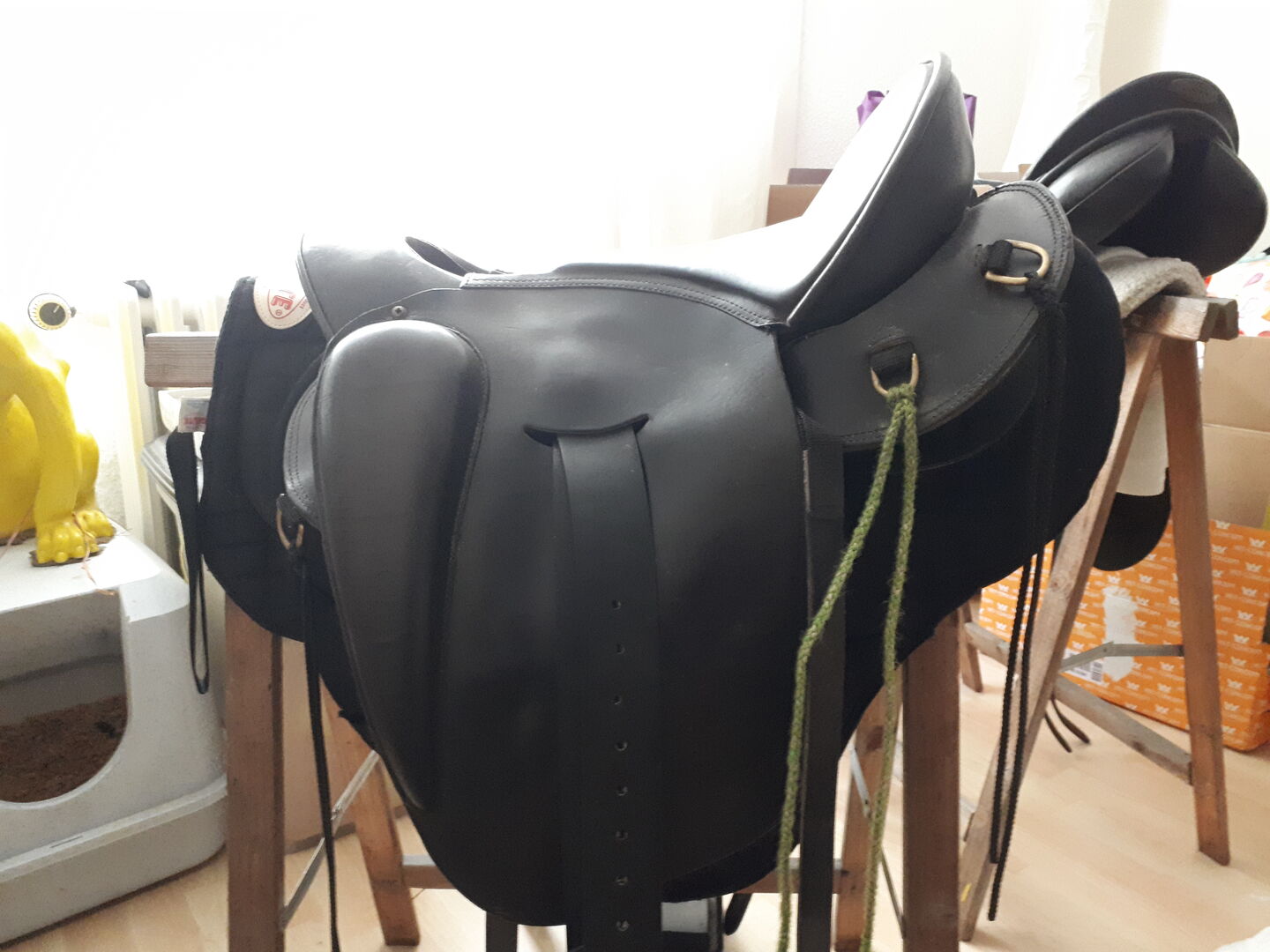 ROC Klassiek Zadel voor Trail Paardrijden - Het zadel is al ouder, maar nog in goede staat. Maat 16" L, plastic boom. . . De dekselset heeft een hoekje, maar is volledig bruikbaar. De opvulset ontbreekt. Wordt geleverd met stijgbeugels.