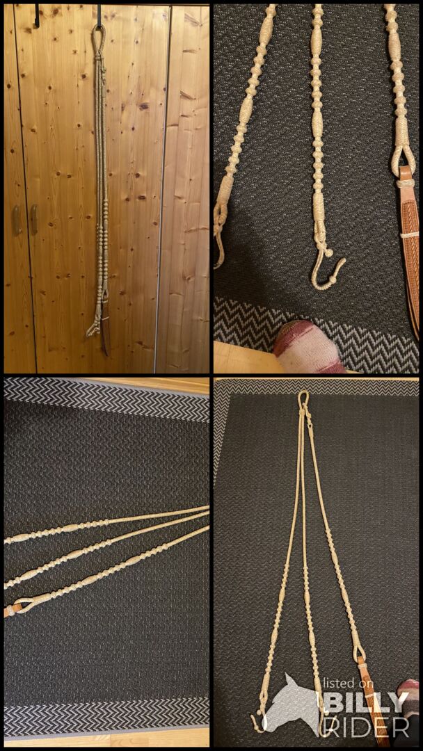 Gesloten westernteugels voor het rijden in de oude Californische rijstijl met schachtbitjes. Deze Romal teugels zijn gevlochten van zuivere runderhuid. In tegenstelling tot goedkopere versies, die een kunststof kern hebben, is de kern van deze teugels ook van runderhuid en dus van veel hogere kwaliteit. Vooral deze versie, met zijn 30-plait weving, is zeer gedetailleerd gemaakt.