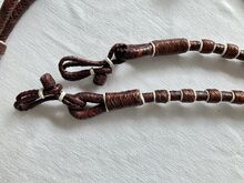 Romal Teugels - Ik verkoop deze nieuwe roodbruine, ruwhuiden Romal teugels met leren flap. Ze zijn niet gebruikt. Op de een of andere manier niet van mij. Lengte van de teugels 1,40m. Lengte van de flap 27,5cm. Lengte van de brug incl. flap 1,63m. Diameter 13mm.