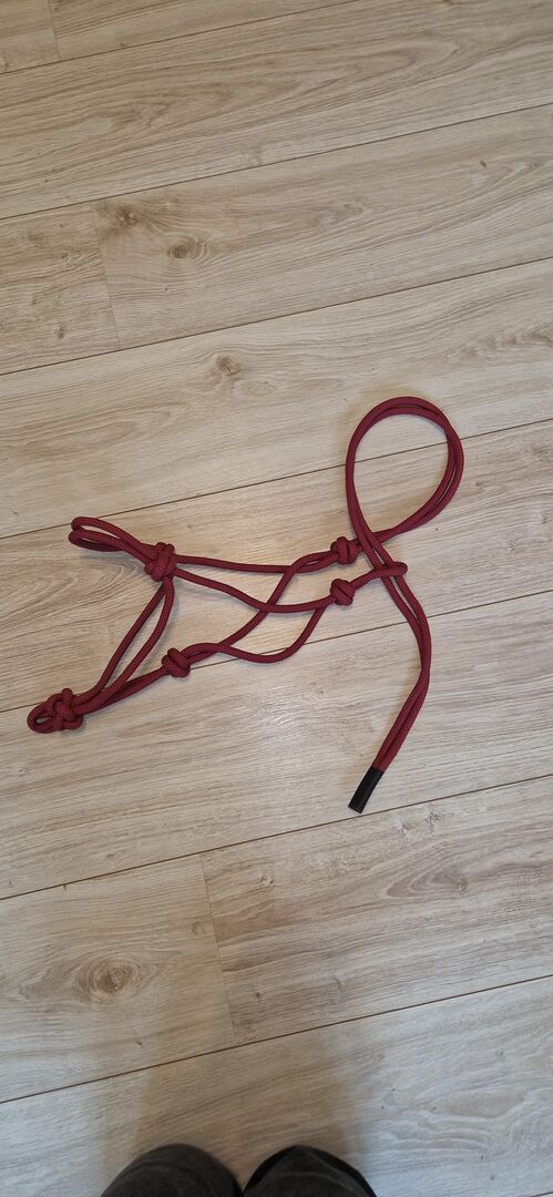 Rood geknoopt halster maat Cob - De Knoti zat op een Tinker, helaas is hij hier te klein omdat hij een erg groot hoofd heeft.