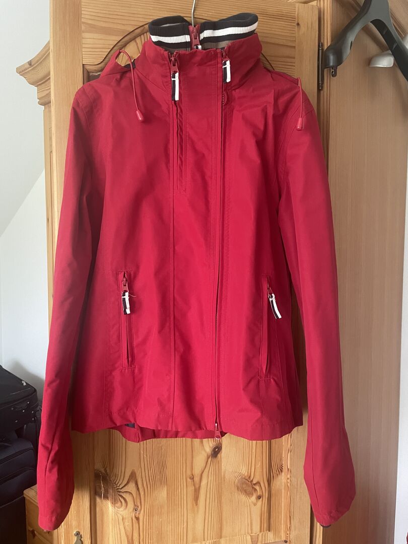 Rood overgangsjasje - Chique rode overgangsjas van Steeds te koop! De kleur is zoals op de foto - echt kersenrood! Alle ritsen van de jas zijn intact: 2 ritsen om te sluiten, een kraagrits om meer ruimte te hebben voor een sjaal en twee ritsen bij de zakken. De kap is niet afneembaar, maar kan indien nodig met een elastiek worden versteld. Manchetten in dezelfde stijl als de kraag. Ritssplitten aan de achterkant met drukknopen beschikbaar.
