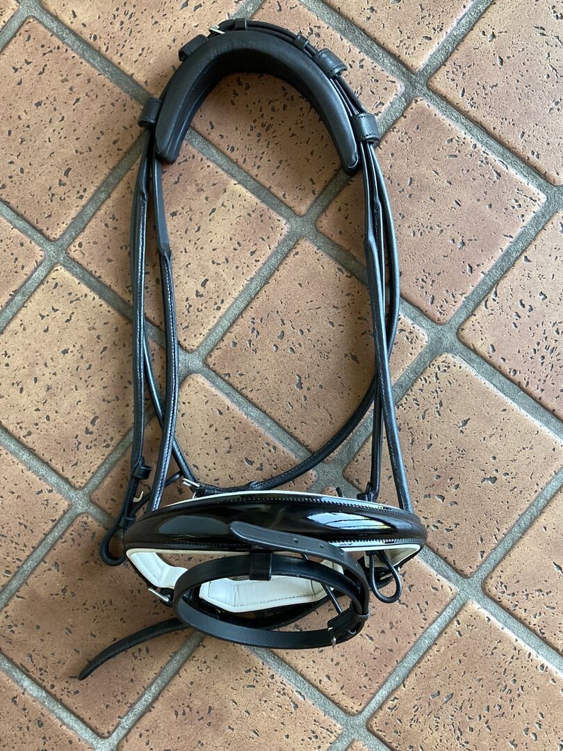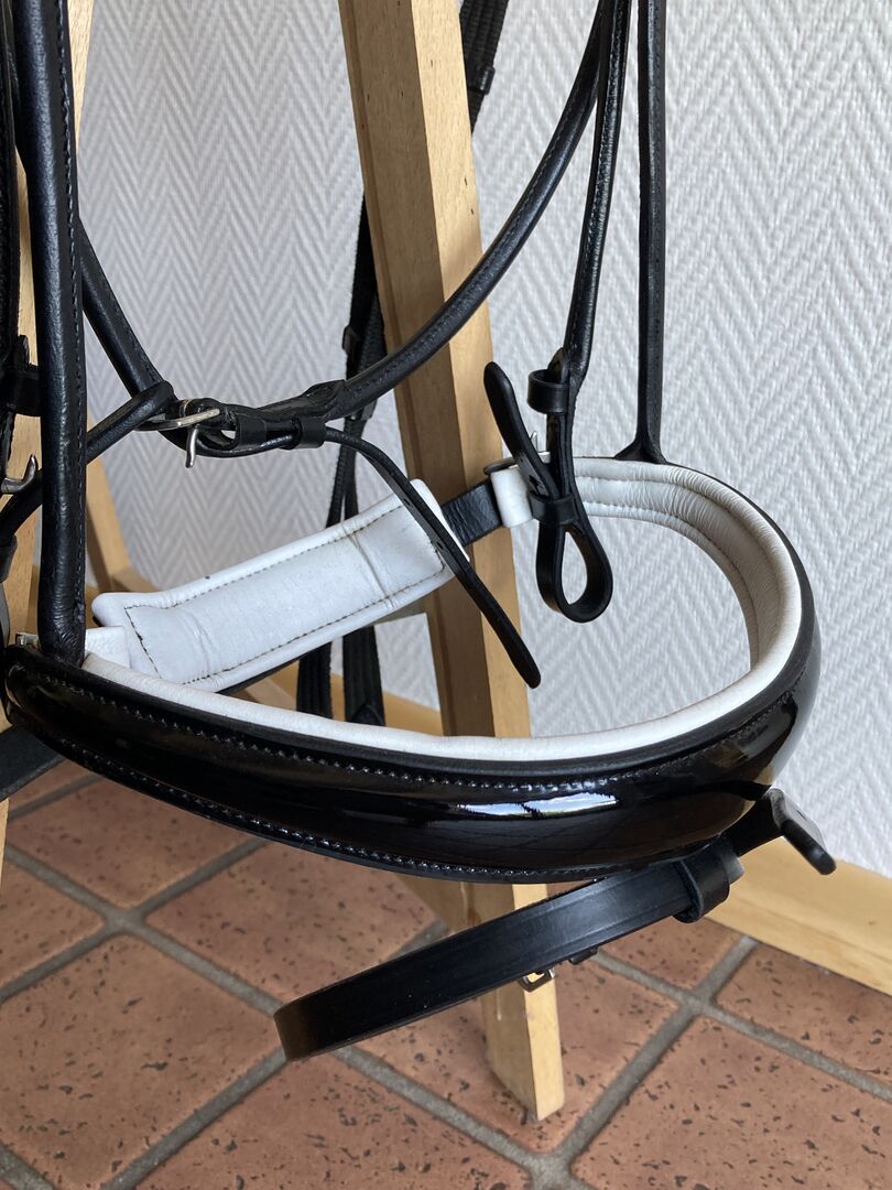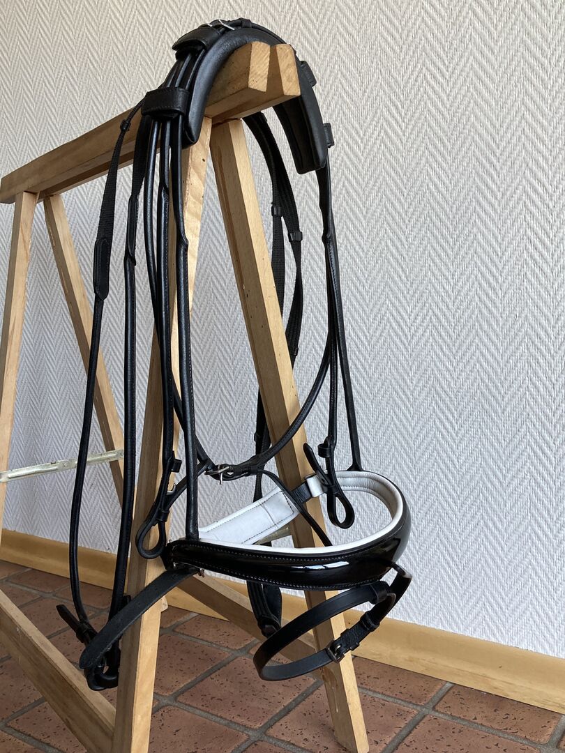 Royal H. Snaffle, VB, rondgestikt met gepatenteerde neusriem - Ik verkoop een Royal H. snaffle (Royal Blue Basic model) in maat VB/Cob, zo goed als nieuw. Helaas heb ik hem maar drie keer gebruikt omdat hij mijn paard niet goed paste. De snaffel is rondgenaaid en heeft een gesp in het halsstuk, dat dik opgevuld is. De neusriem heeft een witte voering en is versierd met lakleer. Bijpassende teugels zijn inbegrepen. Het hoofdstel wordt verkocht zonder frontriem! Originele prijs was 150. Als je nog vragen hebt, neem dan contact met me op :)