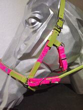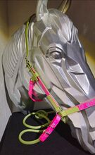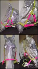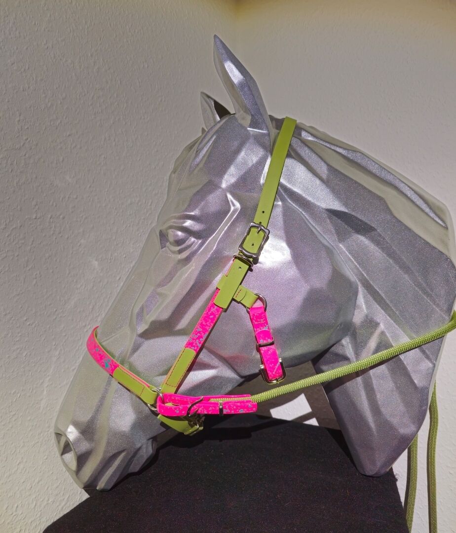 Ruil/Verkoop Biothane Snaffle - Ruilen/Verkopen nieuw ongebruikt biothaan bitloos hoofdstel in de kleur Holy Guacamole-Magenta-Tükis gespikkelde kleurrijke blikvanger met roestvrijstalen beslag, maat warmbloed. incl. premium ppm touwteugels 3 M.