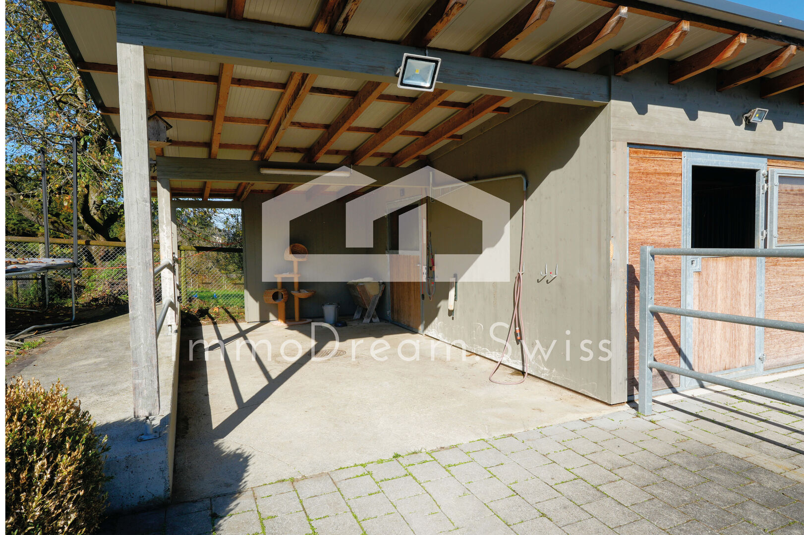 Aan de entreezijde heeft de stal een overdekte paardenwasplaats, binnenin drie paardenboxen van ca. 3,6 x 3,4 m met elk een uitloopgedeelte, drie zadelkasten, wasbak en grote voerruimte met aparte tweedelige deur.