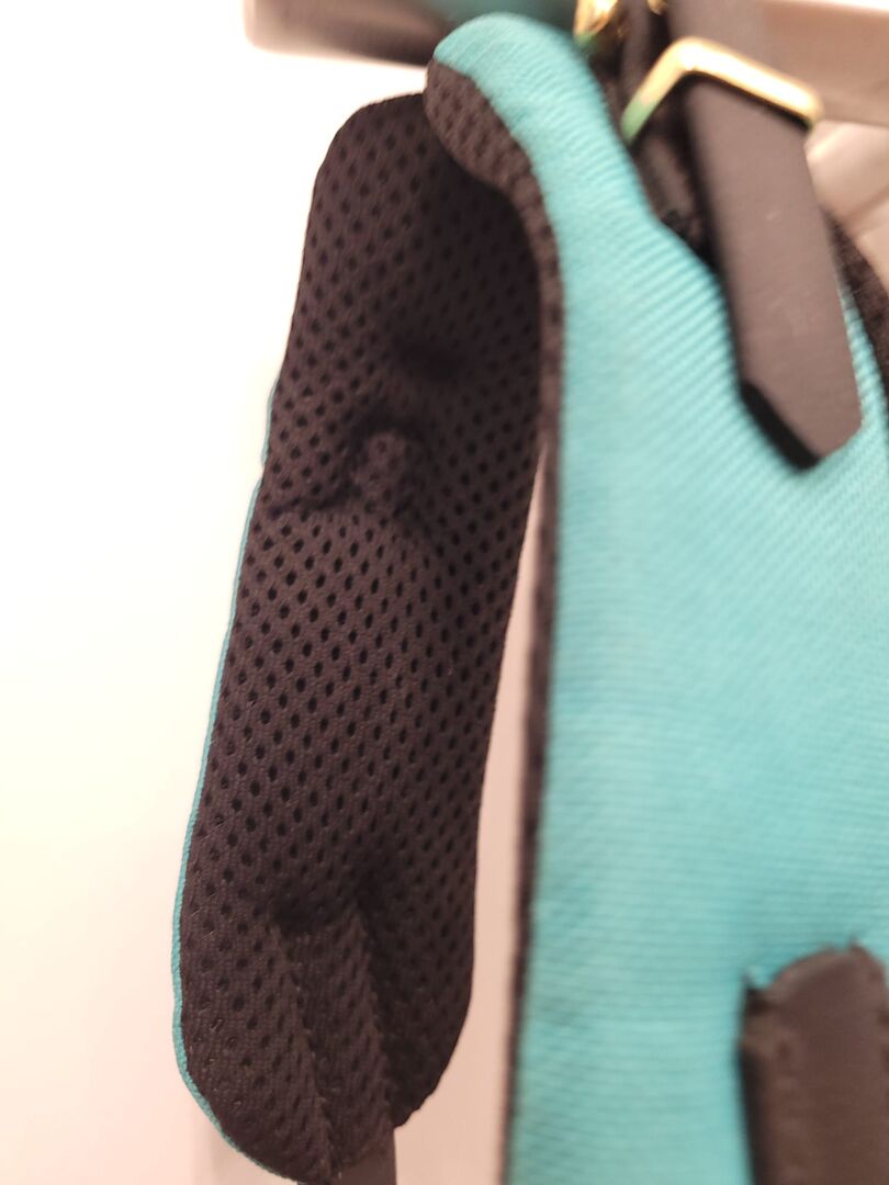 Kleuren: Biothane in zwart zonder contrasterende stiksels met messing beslag. Neuskussentjes in mint Halsdoekjes in turkoois mint Metalen neusboog in nieuwstaat