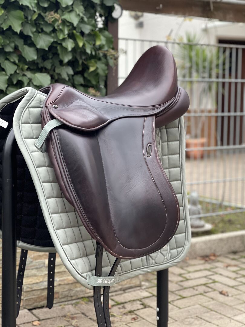 Model: Leopold Zitting: aangegeven als 18,5 inch, maar blijkt 18 inch te zijn. Bouwjaar: 2021 Zadelklep: normaal, monoklep van zacht dekleer Gullet breedte: kan worden aangepast door UGS systeem (zie foto) Vulling: wol, werd onlangs volledig vernieuwd Kleur: bruin Pasvorm: voor rechte tot licht gebogen ruggen met een middelhoge schoft Conditie: het zachte leer is zeer gevoelig, daarom zijn er tekenen van slijtage op het gebied van de stijgbeugelriemen, verder is het in uitstekende staat en zeer goed verzorgd. Leer: Softcover leer Pommels: groot Zitting: diep Singel: lange singelbanden
