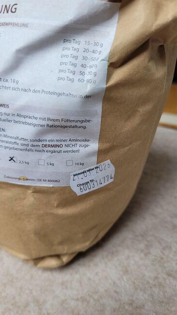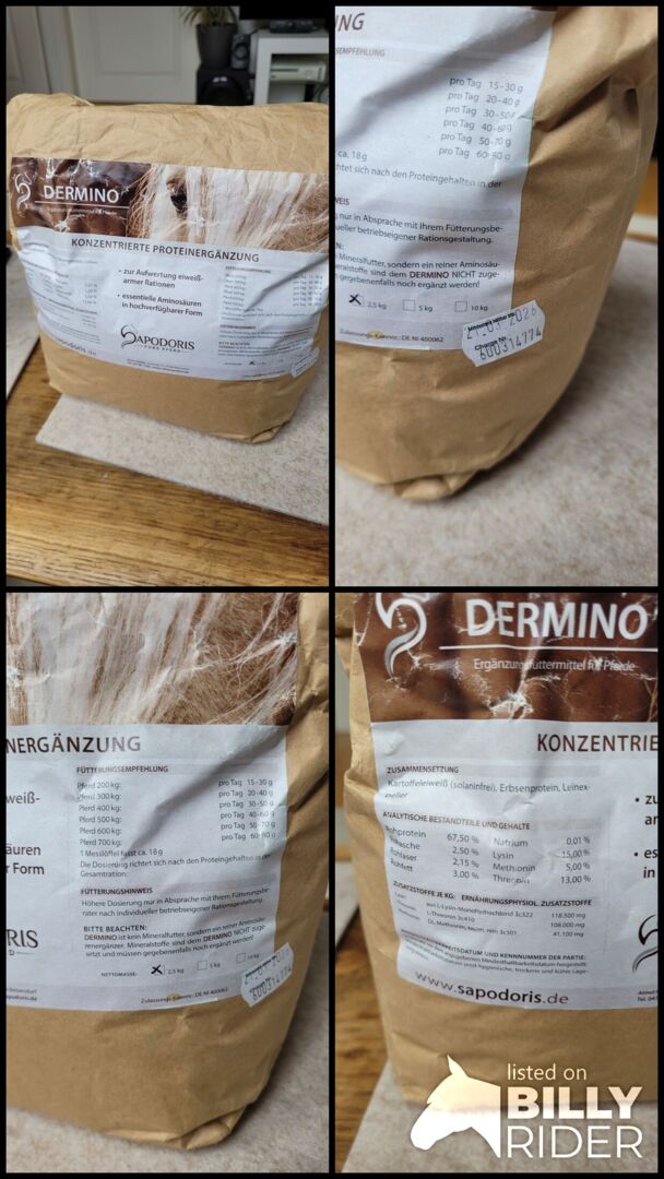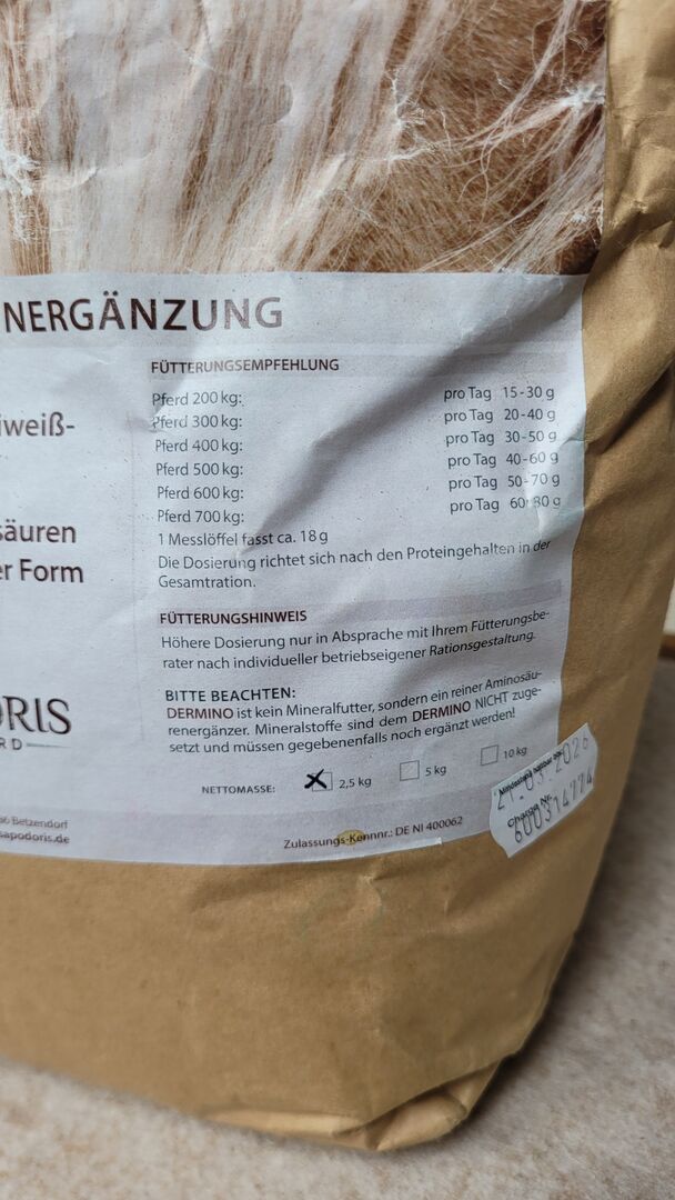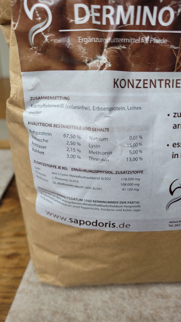 Sapodoris Dermino Eiwit aanvullende aminozuren voor diervoeders - Zak Dermino eiwitbijvoeder van Sapodoris van 2,5 kg geopend. Er zijn een paar dagelijkse porties uit gehaald, maar de zak weegt in totaal nog ongeveer 2,6 kg, dus hij zou nog zo goed als vol moeten zijn. Koel en donker bewaren. Ten minste houdbaar tot maart 2026.
