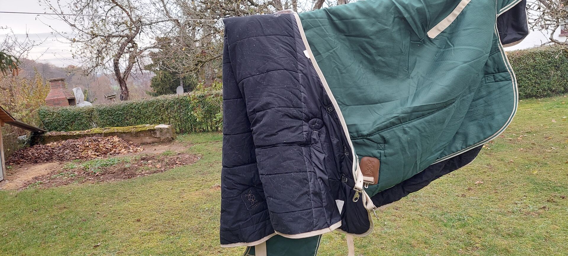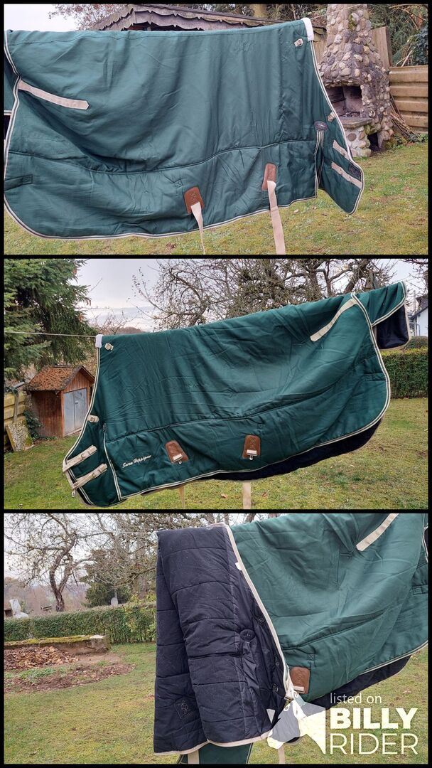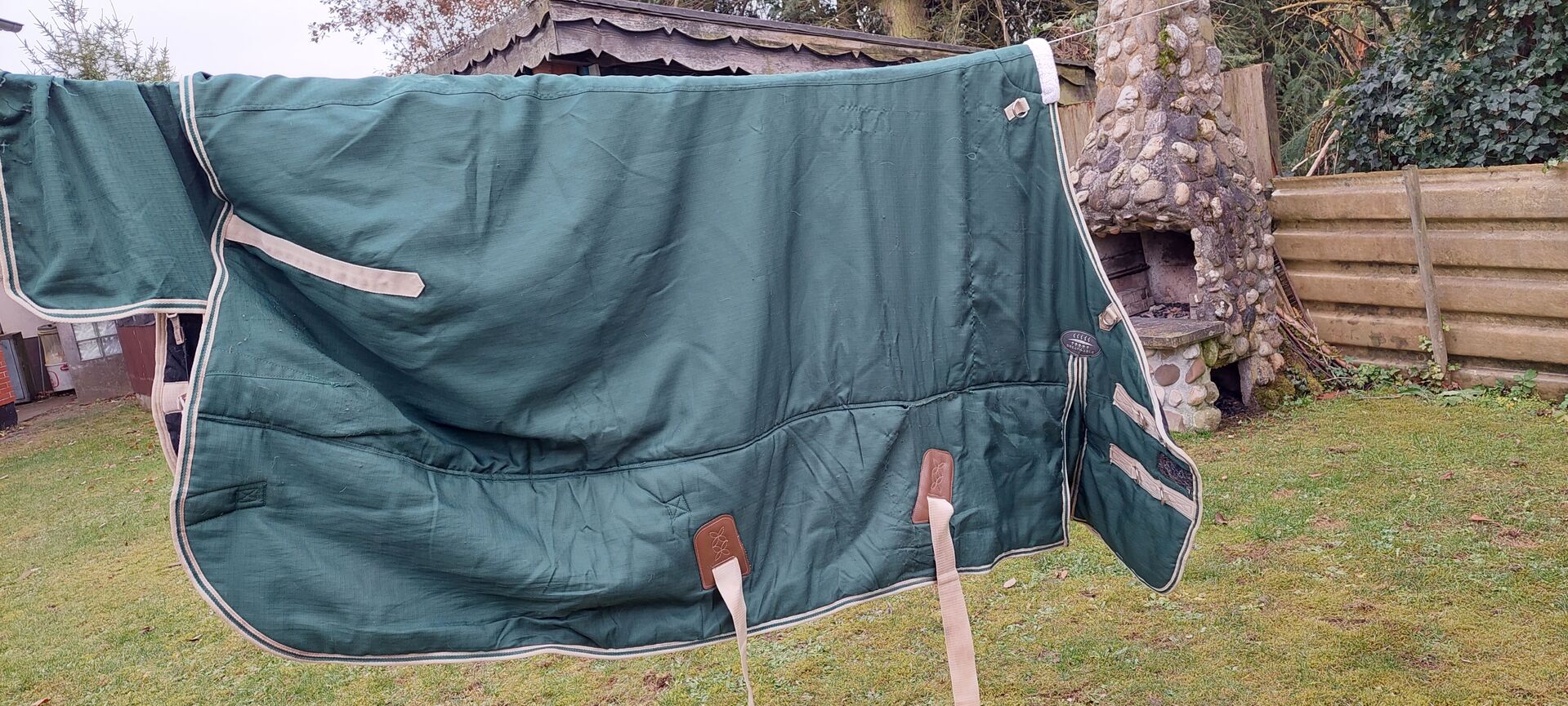 Sarm Hippique Staldeken 155 - Ik verkoop een gebruikte staldeken van Sarm Hippique. De deken heeft een vulling van 300 g. Het heeft gebruikssporen, maar is niet defect. Kleur groen met leren patches. Vaste prijs 15 Euro