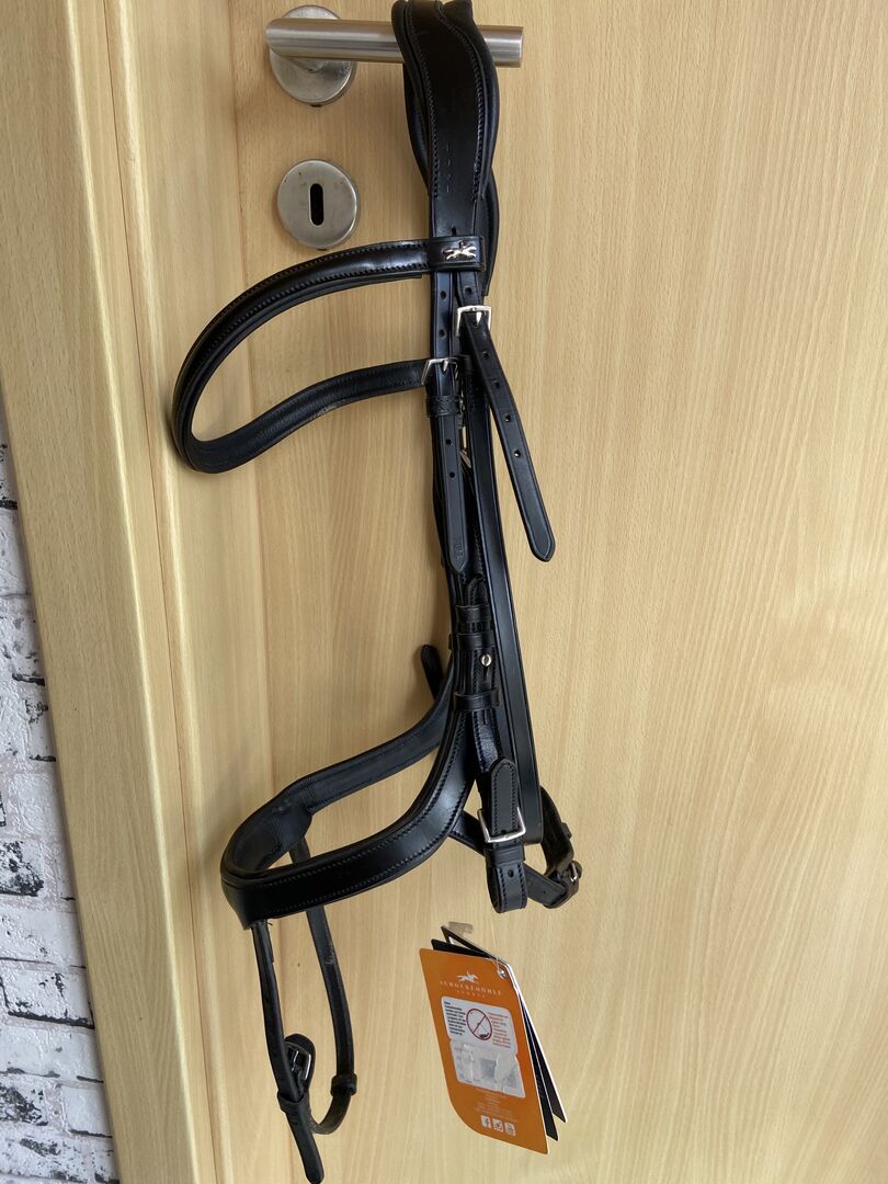 Schockemöhle snaffle anatomisch - Superzachte en lichte anatomische snaffle van Schockemöhle. Het hoofdstel is een tentoonstellingsstuk en is slechts kort op het paard geprobeerd! Maat volledig Kleur zwart NP 275€