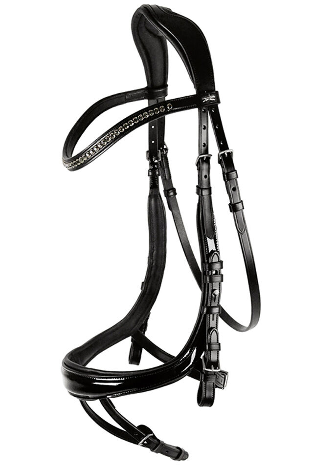 Schockemöhle Sports Snaffle EQUITUS BETA XL-WB patent grijs/zilver - Snaffle zo goed als nieuw, nauwelijks gebruikt. (NP Eur 319,00 zonder teugels). VK Eur 250,00 inclusief teugels. Elegante anatomische speciale snaffle met nieuwe pasvorm van Schockemöhle Sports. Gebogen neusriem omzeilt de belangrijkste gezichtszenuw. Zacht gevoerd hoofdstuk met veel ruimte voor de oren. Gebogen wenkbrauwband versierd met grote kristallen ketting met extra brede pasvorm om druk in het oog-oor gebied te voorkomen. Vrij ademen door verplaatste sluitband, knopnagels voor individuele afstelling. Verdere vragen per post.