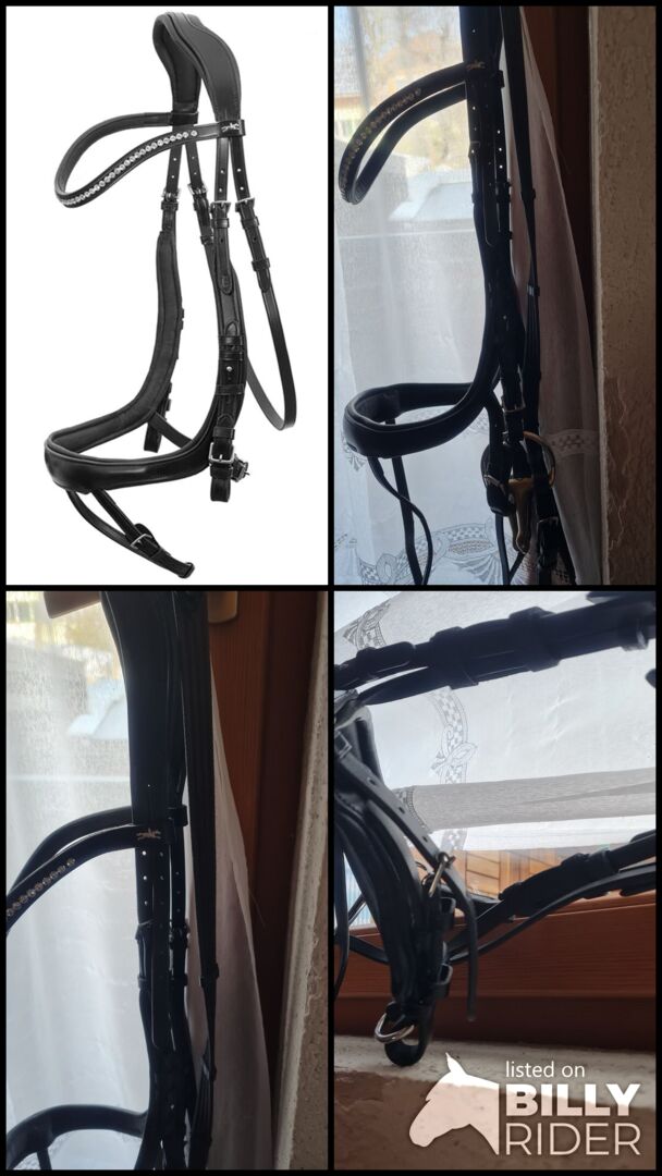 Schockemöhle Sports Snaffle EQUITUS BETA XL-WB zwart/zilver - Snaffle zo goed als nieuw, nauwelijks gebruikt. (NP Eur 319,00 zonder teugels). VK Eur 250,00 + leidsels Elegante anatomische speciale snaffle met nieuwe pasvorm van Schockemöhle Sports. Gebogen neusriem omzeilt de belangrijkste gezichtszenuw. Zacht gevoerd hoofdstuk met veel ruimte voor de oren. Gebogen wenkbrauwband versierd met grote kristallen ketting met extra brede pasvorm om druk in het oog-oor gebied te voorkomen. Vrij ademen door verplaatste sluitband, knopnagels voor individuele afstelling. Verdere vragen per post.