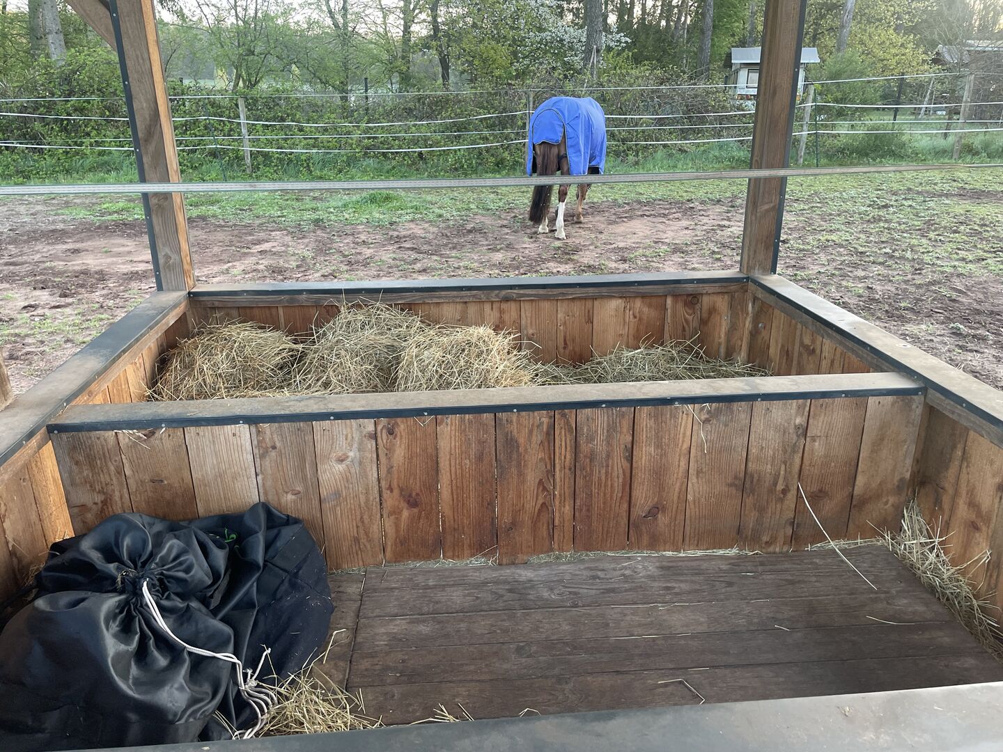 De hooiruif heeft op dit moment een tussenwand in het hooigebied zodat de paarden aparte voederplekken hebben. De middenwand kan natuurlijk verwijderd worden zodat er grote ronde balen in passen.