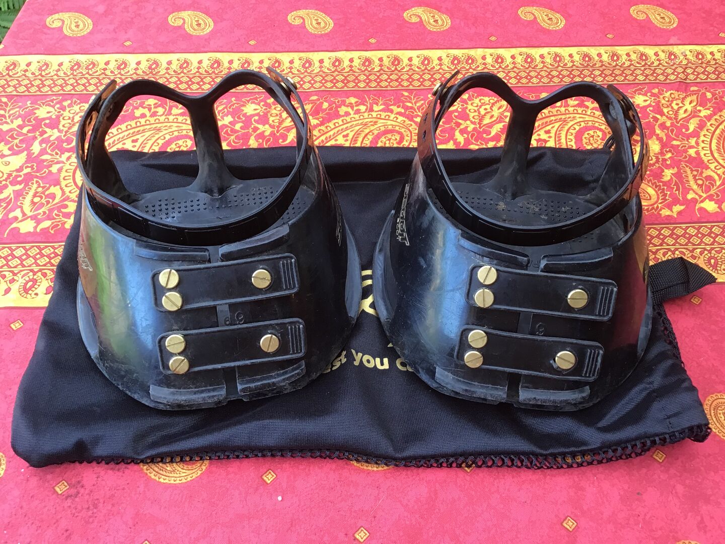 Indien gewenst kan ik ook een paar modderbanden leveren. Indien nodig moeten er beenkappen worden aangeschaft, we zijn ze kwijtgeraakt. Misschien kun je ze extra vastmaken met isolatietape, dan gaat het klittenband niet zo snel los (zo doe ik het nu met de nieuwe schoenen). Ze werden aan de voorkant gedragen.
