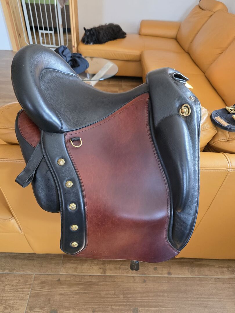 Set bijna nieuwe zadels, Mohiar singels, vilten zadeldekjes, Freejump stijgbeugels - zadel beschrijving Het zadel is absoluut zo goed als nieuw.