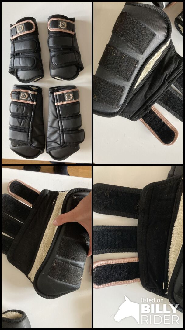 Set van 4 Spats zwart WB Riders Deal Riders Choice Bont Warmbloed - Set van 4 beenkappen (voor & achter) maat WB Riders Deal Riders Choice, lichte gebruikssporen, goede gebruikte staat, pas gewassen, alle klittenbandsluitingen werken perfect, gevoerd met zacht imitatiebont.