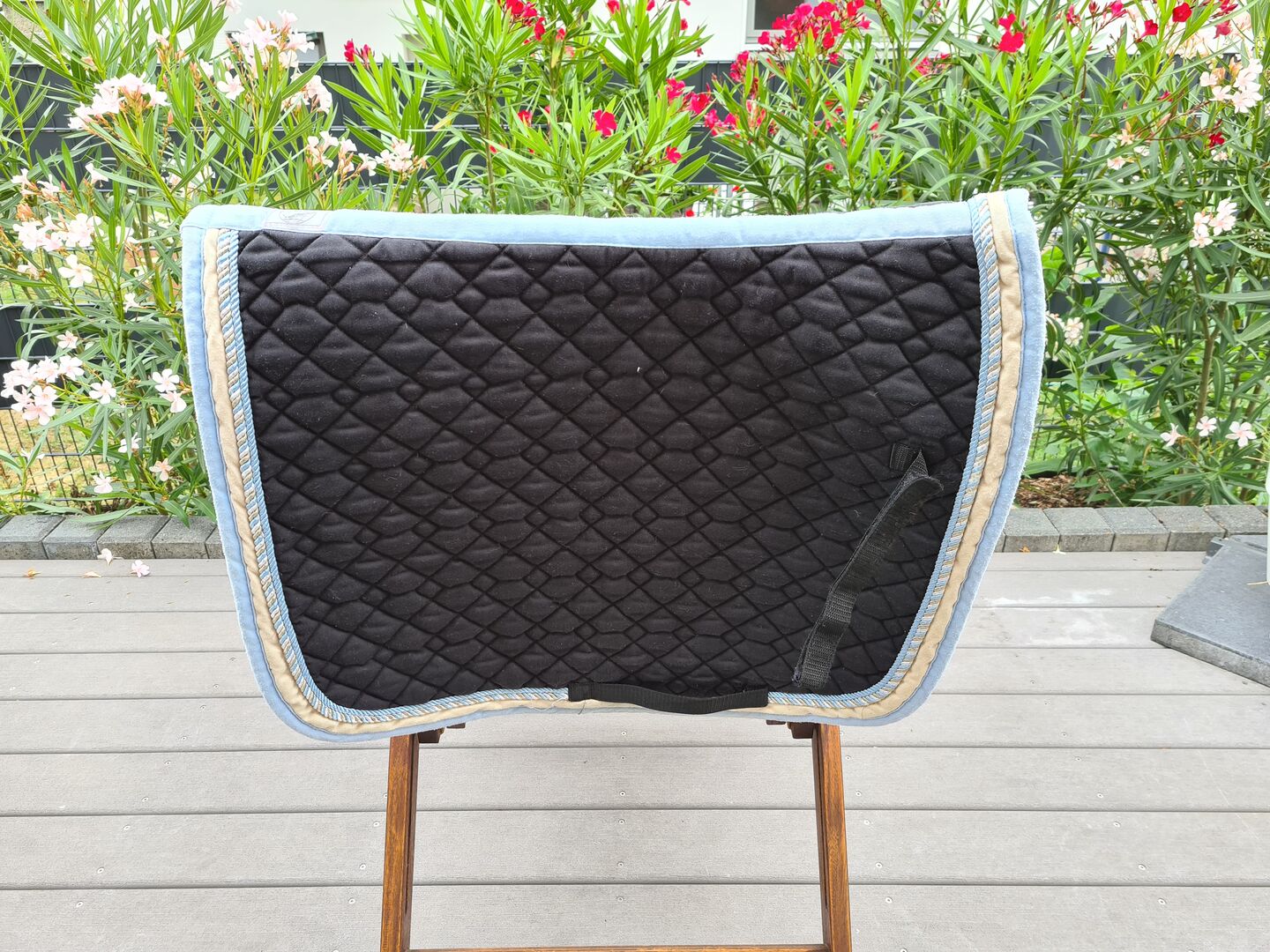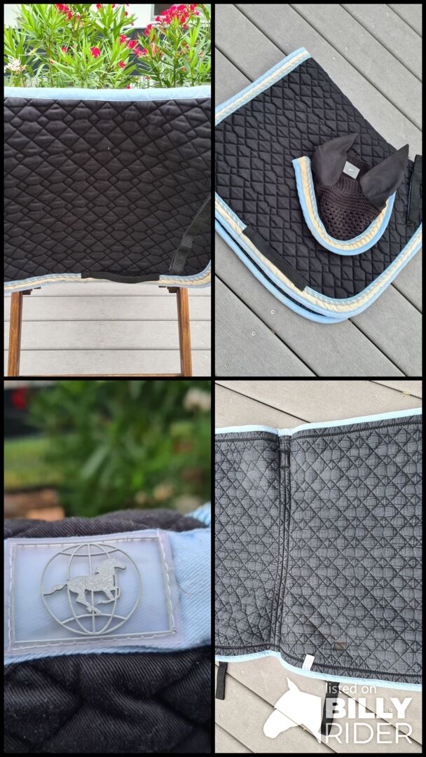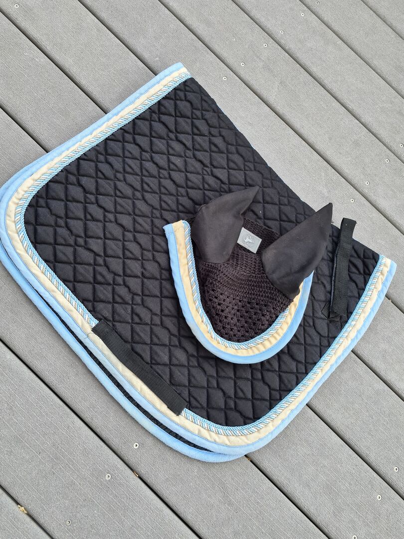 Set zadeldekjes en vliegenmutsen - Set bestaat uit een zadeldek DR maat Full en bijpassend vliegenkapje. Helaas ken ik het merk niet. Het materiaal is katoen en vertoont al wat pilling en vervaging omdat het heel vaak is gebruikt. Klittenband is bevrijd van haar