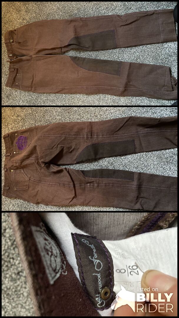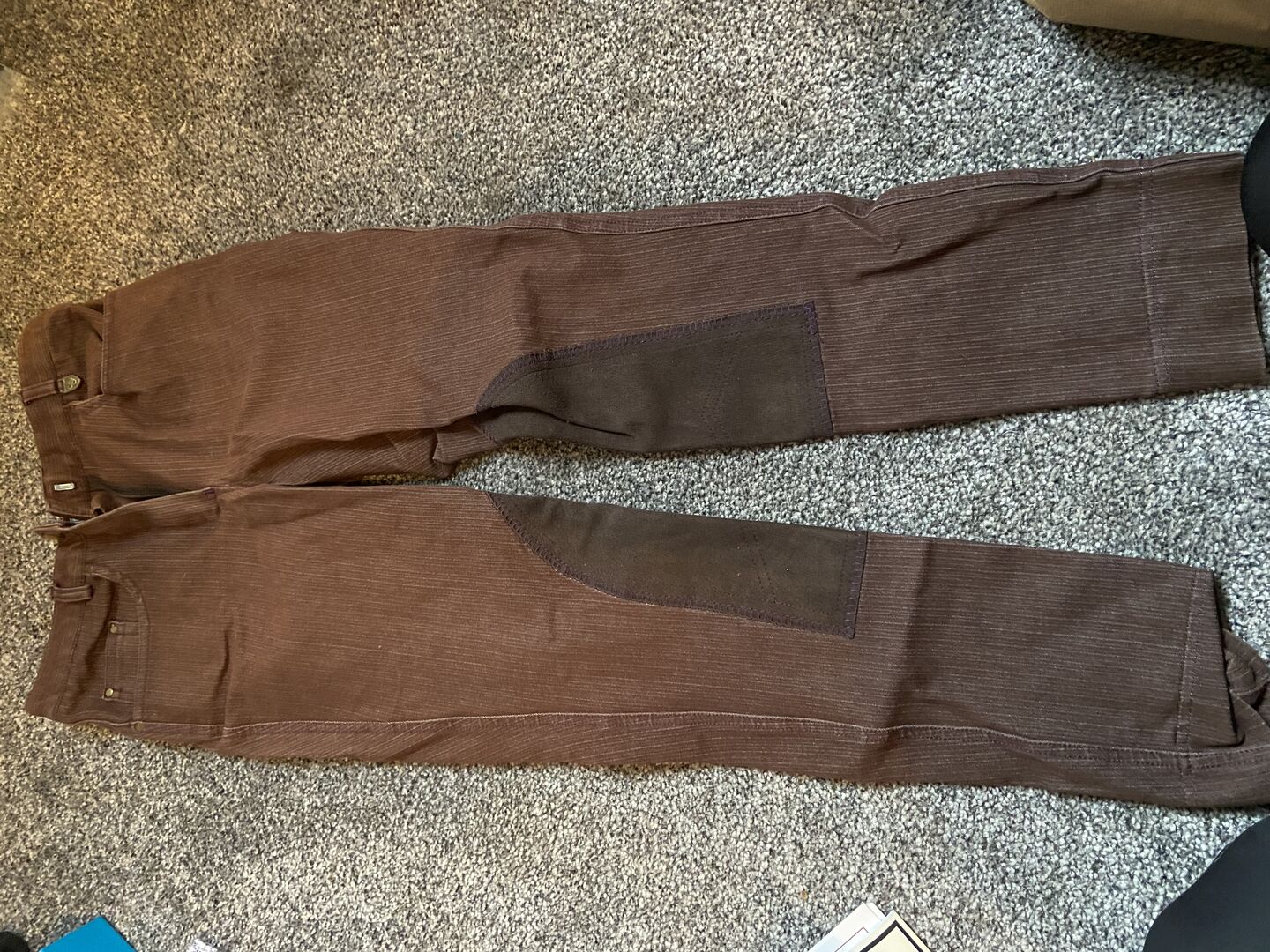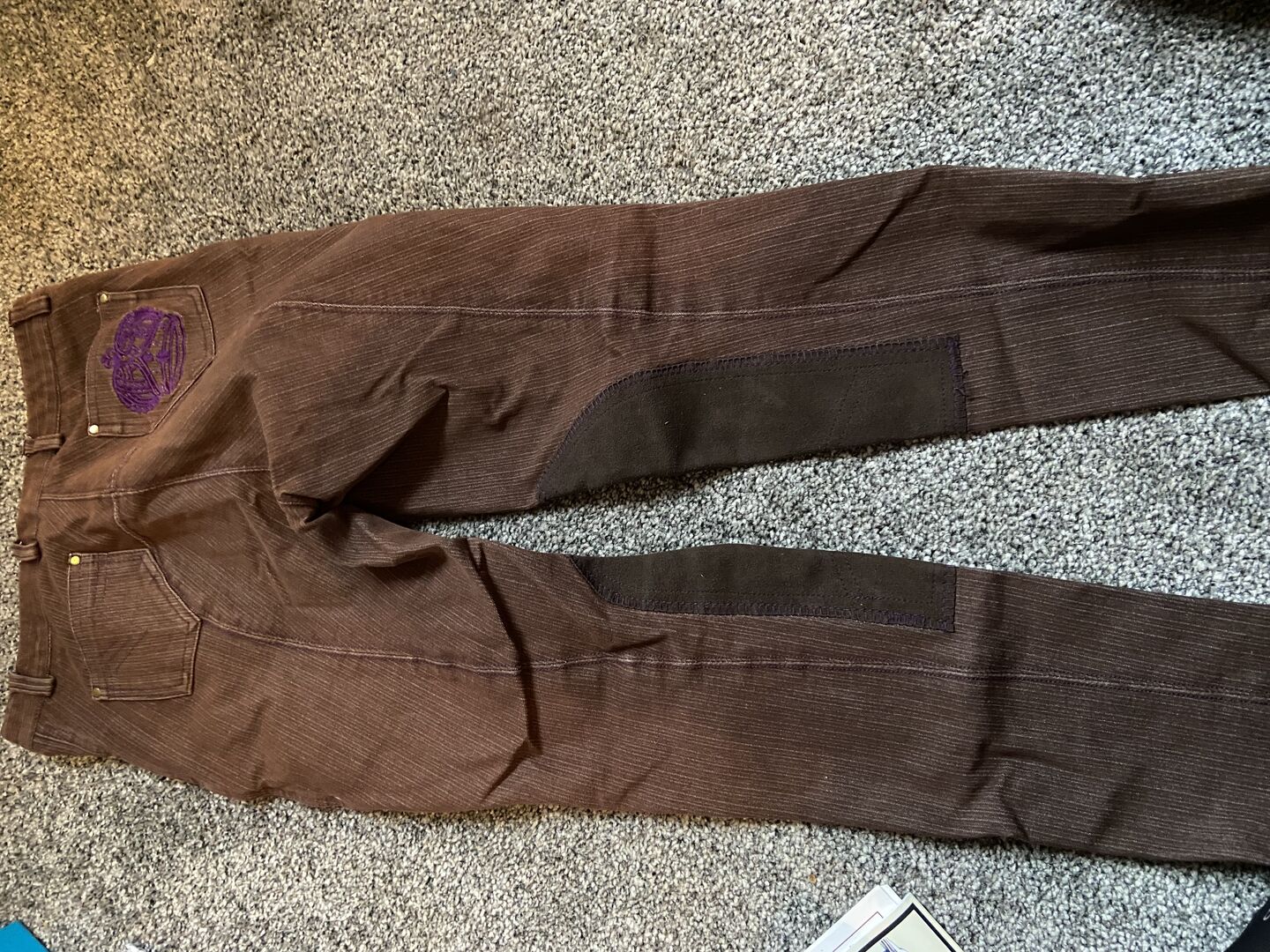 Brown denim Sherwood Forest jodhpurs with purple detailing, size 26”. Little sign of wear