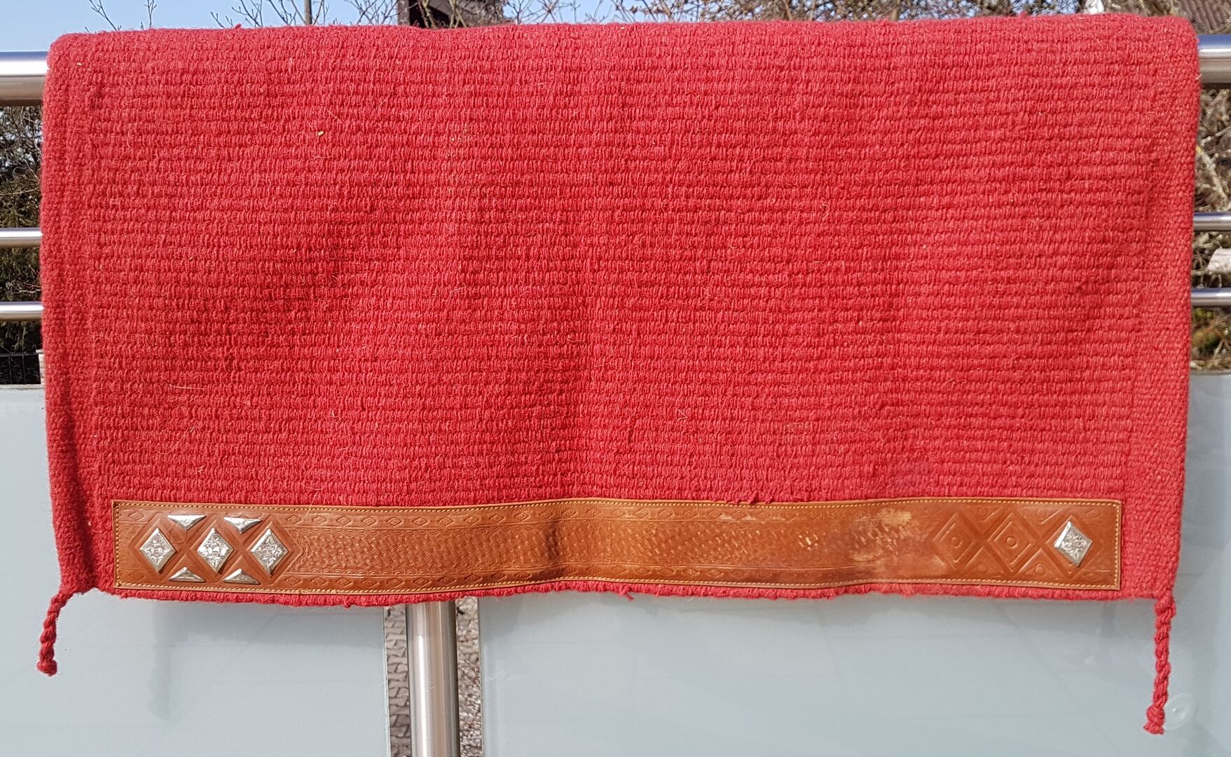 Show Western Deken 90x90 wol gebruikt - Hier bieden we een zelden gebruikte Westerndeken van wol aan. De deken is alleen gebruikt met ondertapijt, heeft een mooie kleur en is visueel afgezet met een (lederen?) rand aan de onderkant.