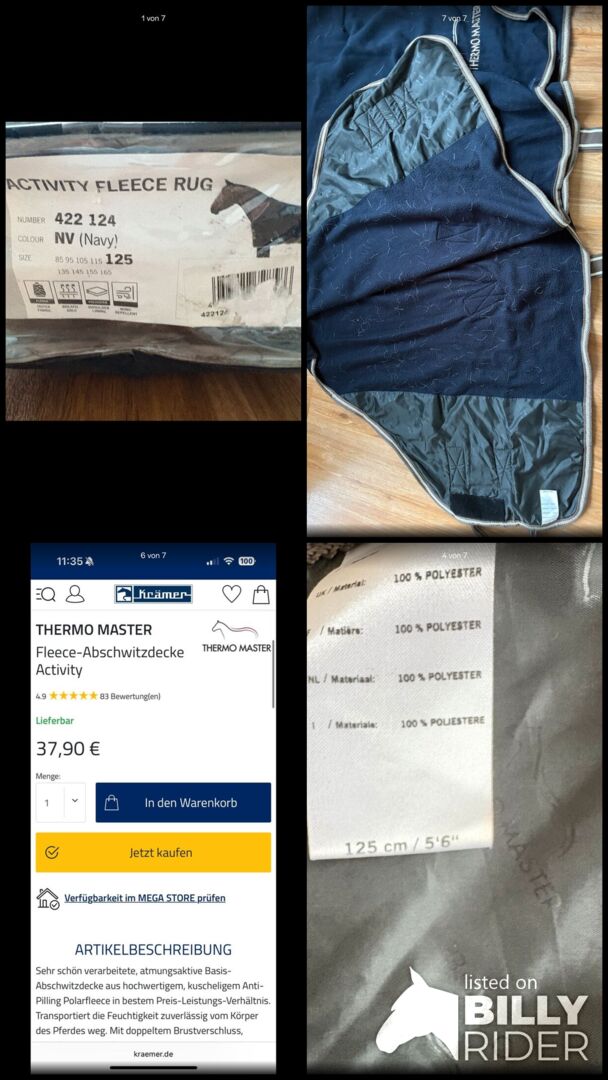 Showmaster Active fleece deken zweetdeken Krämer 125 - Hallo, ik verkoop een gebruikte maar volledig functionele zweetdeken van Krämer (maat 125) in marine/donkerblauw) Met buikriempjes, dus kan ook op stal gedragen worden. De deken wordt ongewassen verkocht en heeft wat paardenhaar. Past op IJslandse paarden. Nieuwprijs 37,90€