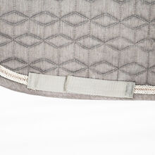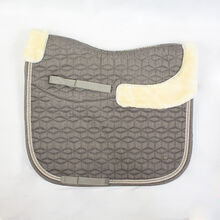 Showmaster Teddy Zadeldekje "Just Sparkle" Walnut DR - Een prachtig dressuur zadeldek van de firma Showmaster. Het mooie trainingszadeldek heeft een grijs/beige kleur. Het heeft een klein quiltwerkje en drie prachtige glitterkoordjes aan de rand in walnoot en goud. Het zadeldek heeft een grote teddyfleece vulling in het gehele zadelgedeelte, alsmede op de zadelrand en bij de schoft. Met discreet metalen logoplaatje en borduursel met glitterdraad langs de ruglijn. Uitgerust met zadel- en singellussen met praktische KV's. Het is gemaakt van 100% katoen en de teddy fleece is 100% polyester. Zij heeft een ruglengte van 51 cm en een diepte van 54 cm. Hij is in zeer goede staat en heeft geen gebreken. De teddy fleece ziet er als nieuw uit. To the seller's offerlaunch