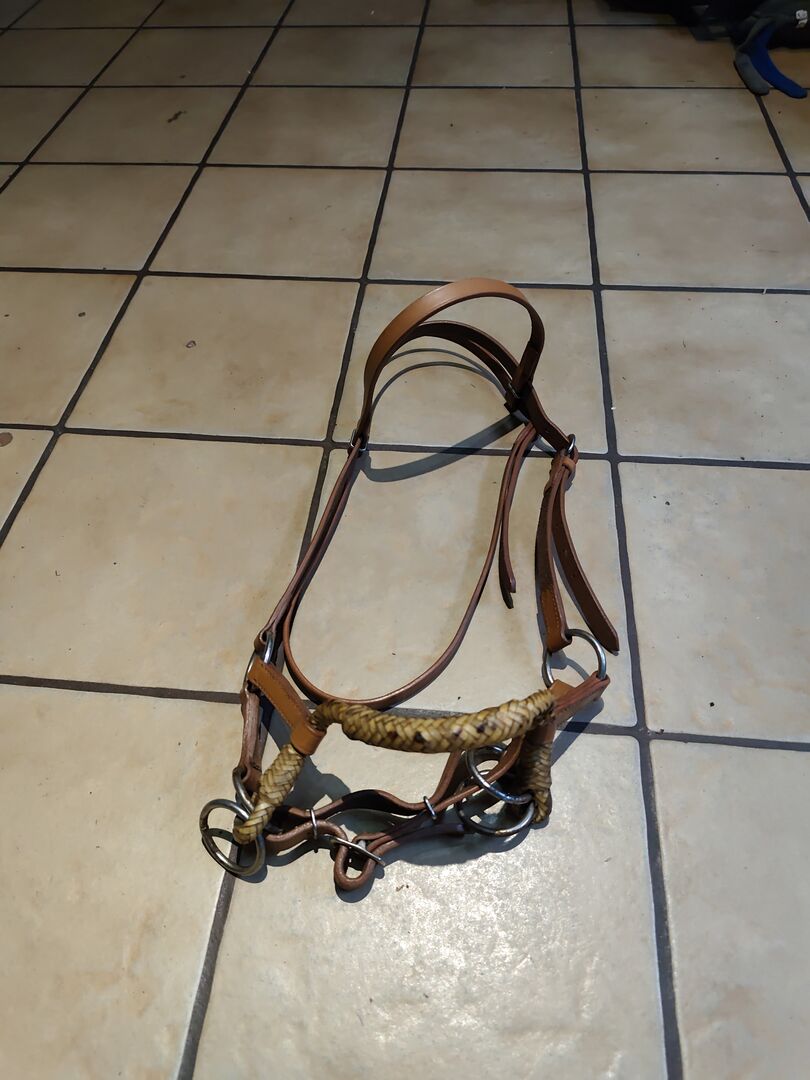 Gebruikte sidepull. Werd gebruikt voor een kwart. Aan één kant laat het vlechtwerk van de runderhuid los. Zonder teugels. Verzending mogelijk tegen kostprijs