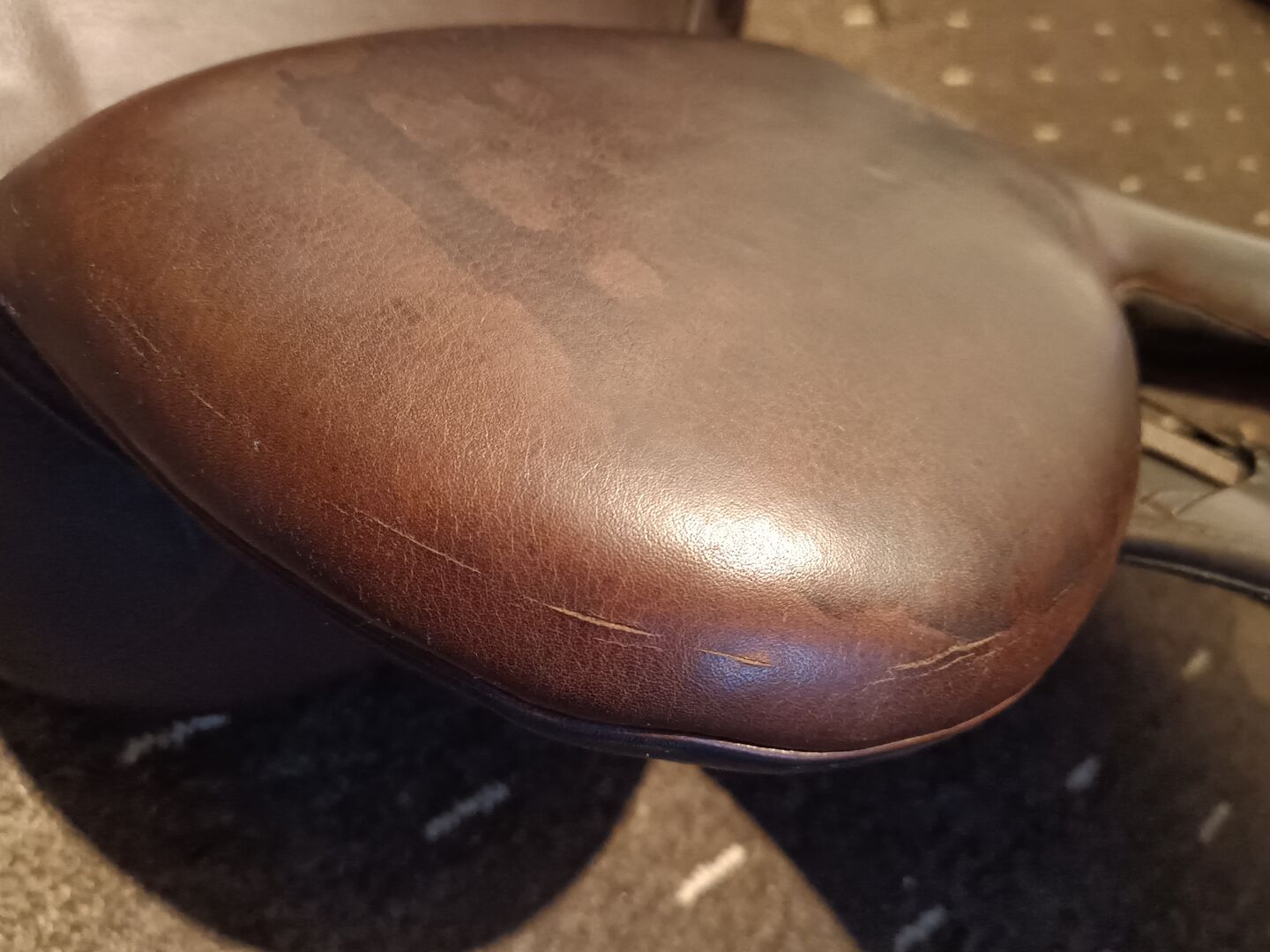 Zitting komt overeen met broekmaat 34-38, wat ongeveer 17" zou moeten zijn (tweede probleem, daarom geef ik hem weg: ik pas er niet meer in 😓). Helaas heeft het een paar kleine scheurtjes in het kussenleer, dus het is te koop voor veel minder dan het waard is. Verder is het, zoals typisch is voor bruine zadels, licht verkleurd aan de onderkant van het dijbeen op de rand van de zadelklep (meer roodbruin). Het zadel is relatief weinig gebruikt, waardoor de originele nerf van het leer nog grotendeels intact is.