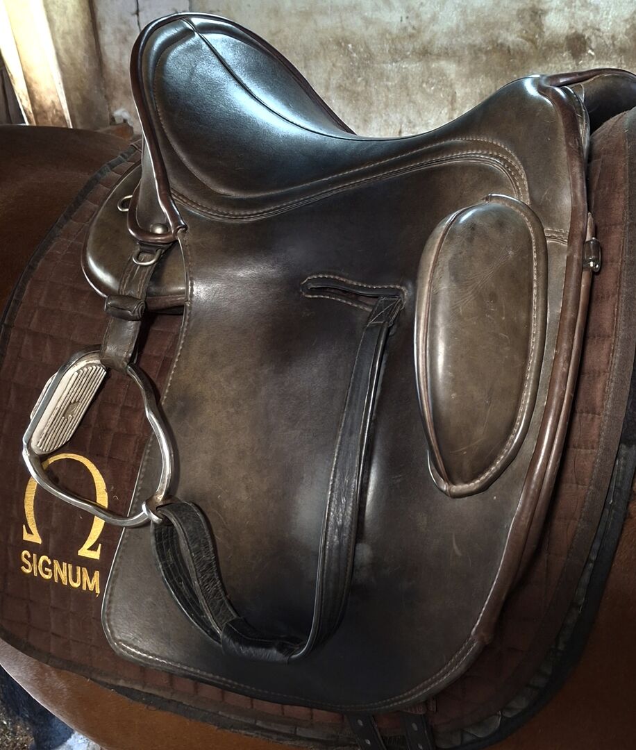 Signum zadel model Rose - Ik verkoop mijn licht gebruikte, 6 jaar oude Signum zadel model "Rose", dat me altijd goed heeft gediend in Working Equitation, maar helaas niet meer bij me past. Kleur zwart/bruin met bruine stiksels, makkelijk verstelbare slokdarmplaat (eenvoudig te verstellen met een 12 mm steeksleutel), zitmaat 18 inch, incl. stijgbeugels en originele singelstoten, eventueel met singel. Door de verstelbare slokdarmplaat kan het zadel voor veel paarden precies passend gemaakt worden. Het zadel zit zeer comfortabel en is gebruikt voor Working Equitation. NP (zie bijgevoegde factuur) € 3.210,--