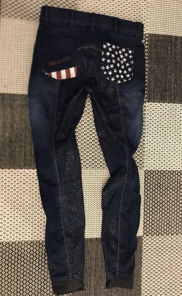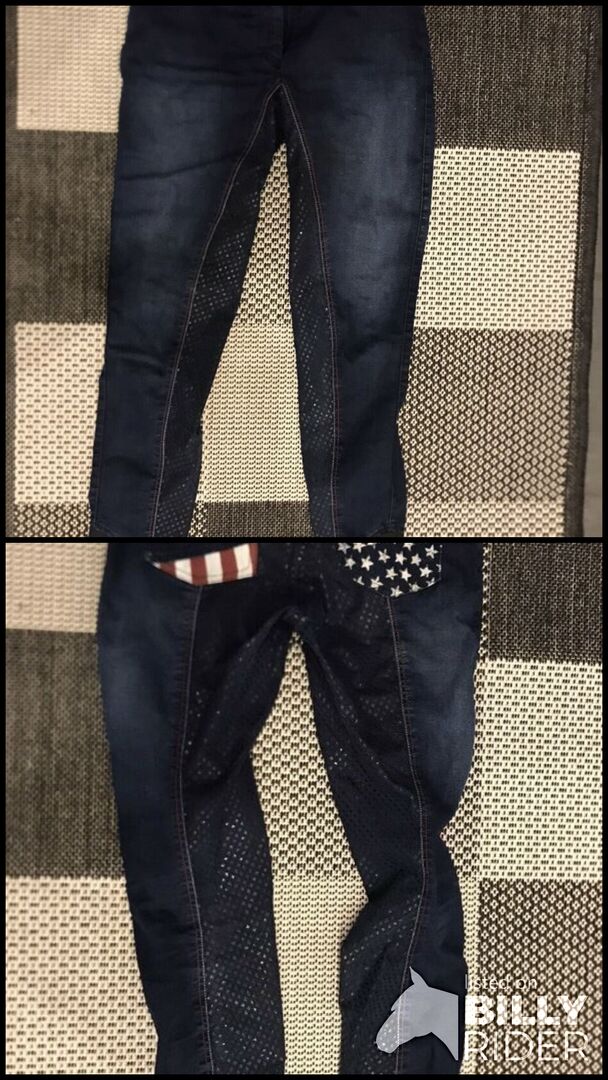 Ik verkoop een paar zelden gedragen rijbroeken in jeansblauw. Ze zijn als nieuw. Maat: 34