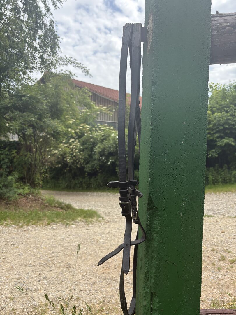 De snaffle is met plezier gebruikt. Hij heeft normale gebruikssporen en is daarom in goede staat. De snaffle wordt verkocht met teugels en geïntegreerde flitsriem.