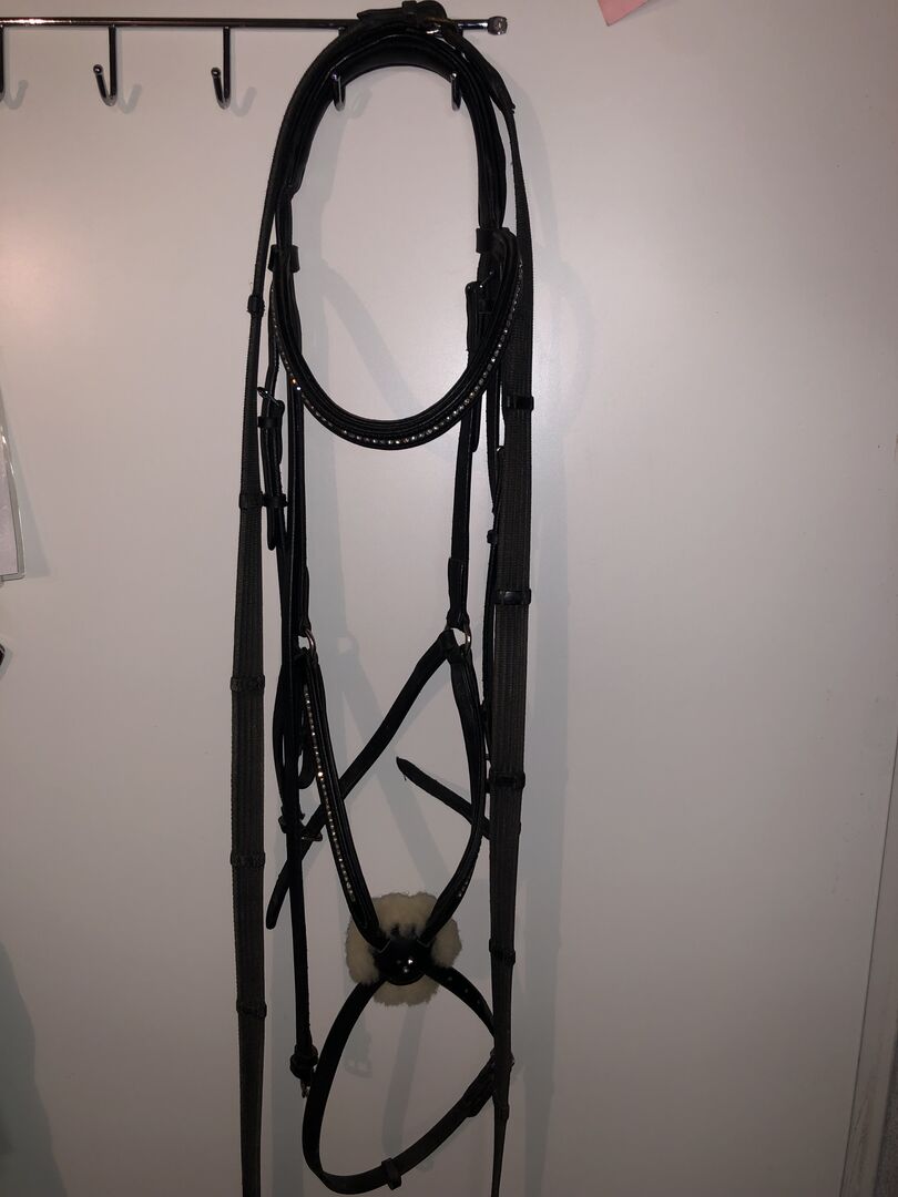 Snaffel met Mexicaanse Caveson zwart, glitter - Mexicaanse snaffel met glitters en lamsvel Helaas ontbreken er een paar steentjes, lamsvel is als nieuw Maat Vol Zonder bit, met teugels