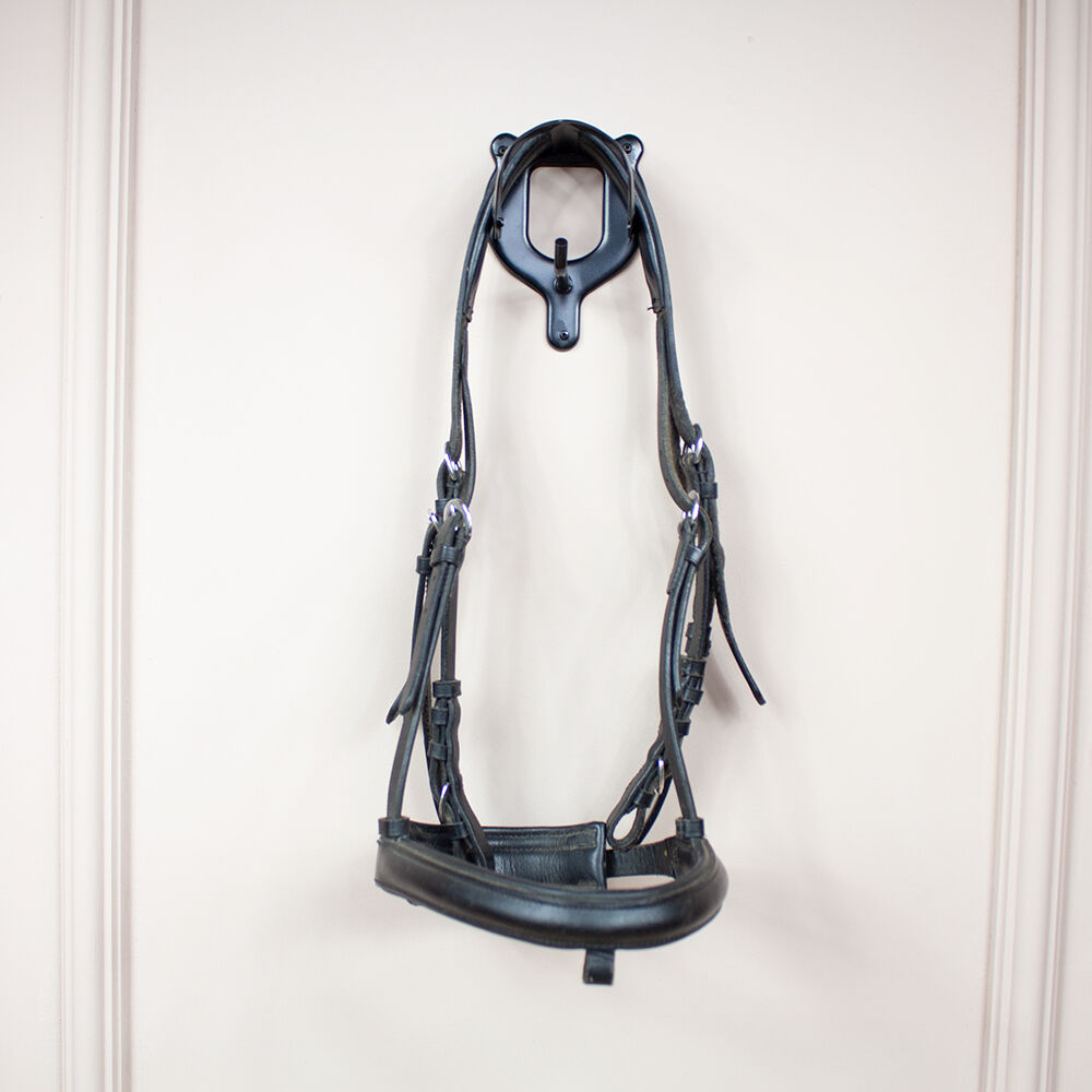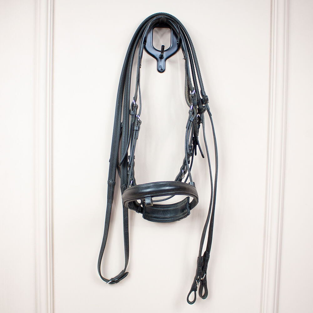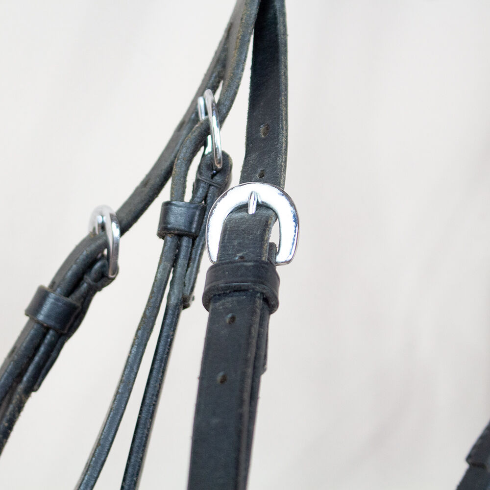 Snaffel zwart VB - Dit prachtige zwarte snaffle hoofdstel is de perfecte dagelijkse metgezel. Het is een volbloed maat en is gemaakt van leer. De snaffel heeft een gevoerd halsstuk, een zacht gevoerde neusriem en een gevoerde kinriem. De snaffel heeft een vergrendelingsriemlus, maar wordt geleverd zonder vergrendelingsriem. Er ontbreekt ook een wenkbrauwband. Zwarte rubberen teugels zijn inbegrepen. Het heeft gebruikssporen en het leer vertoont hier en daar slijtage. To the seller's offerlaunch